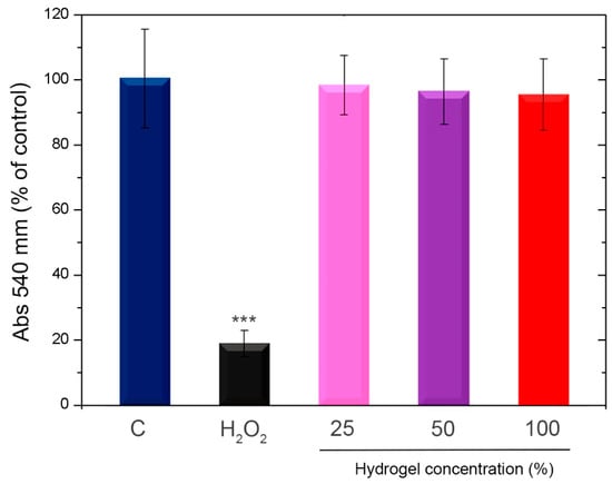 The cytotoxicity of the hydrogel HZ 7.5 was evaluated using the neutral red uptake assay (NRU), following the ISO 10993–5: 2009 guideline as before [16,43]. The cytotoxicity was indirectly evaluated through the incubation of the cells with the extracted medium of the hydrogels. Briefly, after adding 2 × 2 mm2 fragments to 5 mL of culture media, the mixture was cultured for 24 h at 37 °C. Concentrations of 25 to 100% of the discharged media were diluted and added to the cells. In parallel, 96-well plates were seeded with 2 × 105 cells/well in triplicate. After that, the cells were exposed to progressively higher concentrations of the substance extracts for a full day. The cells were incubated in the culture medium as a control, and 1% hydrogen peroxide was added to the culture medium as a positive control of cell death. Following treatment, the cells were cultured with neutral red media (NR medium) (1 mL stock solution 3% NR in 79 mL of DMEM 1.5% SFB) after being cleaned with phosphate buffer of pH 7.4 at 37 °C. Following a three-hour incubation period with the NR media, the cells were rinsed with phosphate buffer, and the dye that the cells had ingested was extracted using a 1% acetic acid, 50% distilled water and 49% ethanol 96° solution. Lastly, a Biotek Synergy HT plate reader (BioTek Instruments, Inc., Winooski, VT, USA) was used to quantify the absorbance at 540 nm.