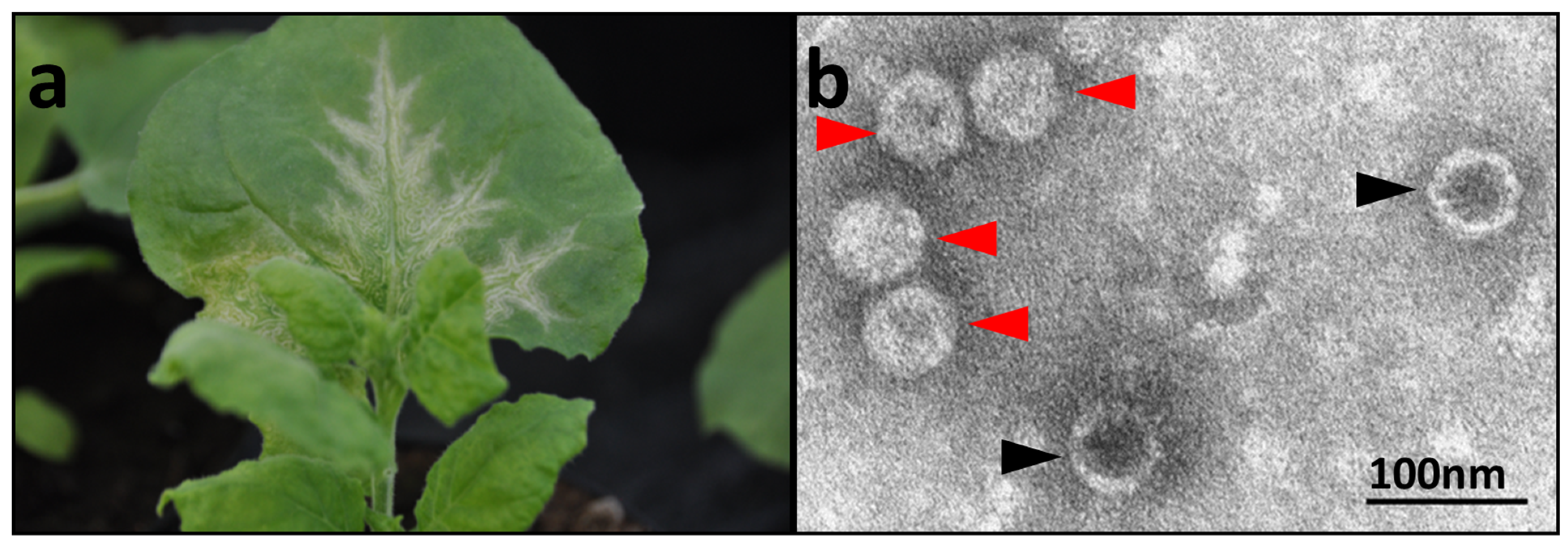 - Fuchs, M.; Hily, J.M.; Petrzik, K.; Sanfaçon, H.; Thompson, J.R.; van der Vlugt, R.; Wetzel, T. ICTV Report Consortium. ICTV Virus Taxonomy Profile: Secoviridae 2022. J. Gen. Virol. 2022, 103, 881–899. [Google Scholar] [CrossRef]