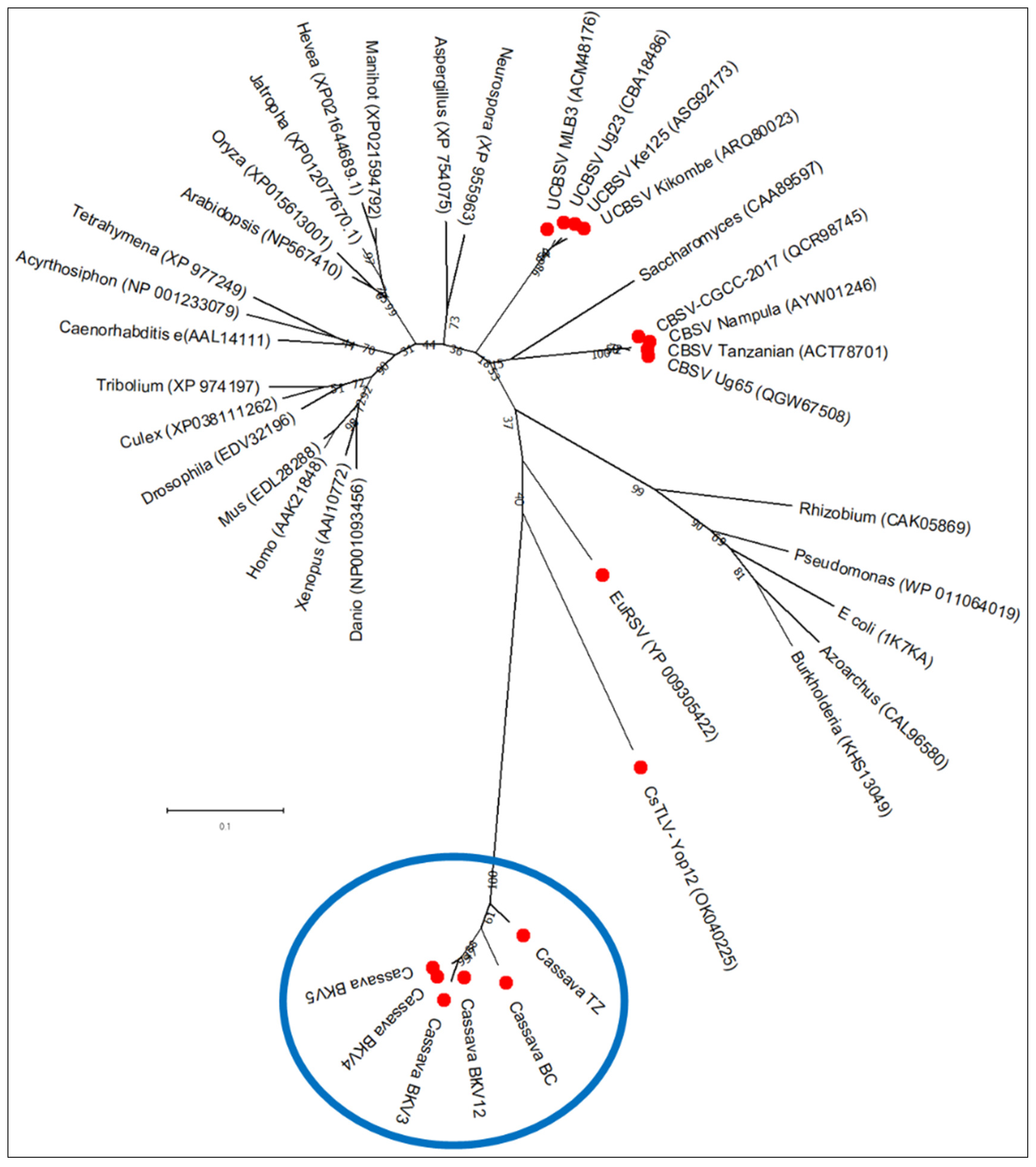 - Lopez, R.-G.; Gonzalo, I.; Garcia, J.-A.; Valli, A.A. Cassava and Ugandan cassava brown streak virus, an attractive case of plant-pathogen coevolution. In III Reunion de la Red Nacional de Virologia de Plantas; Lopez, P.-G., Ed.; RENAVIPLANT: Murcia, Spain, 2022; p. 78. [Google Scholar]