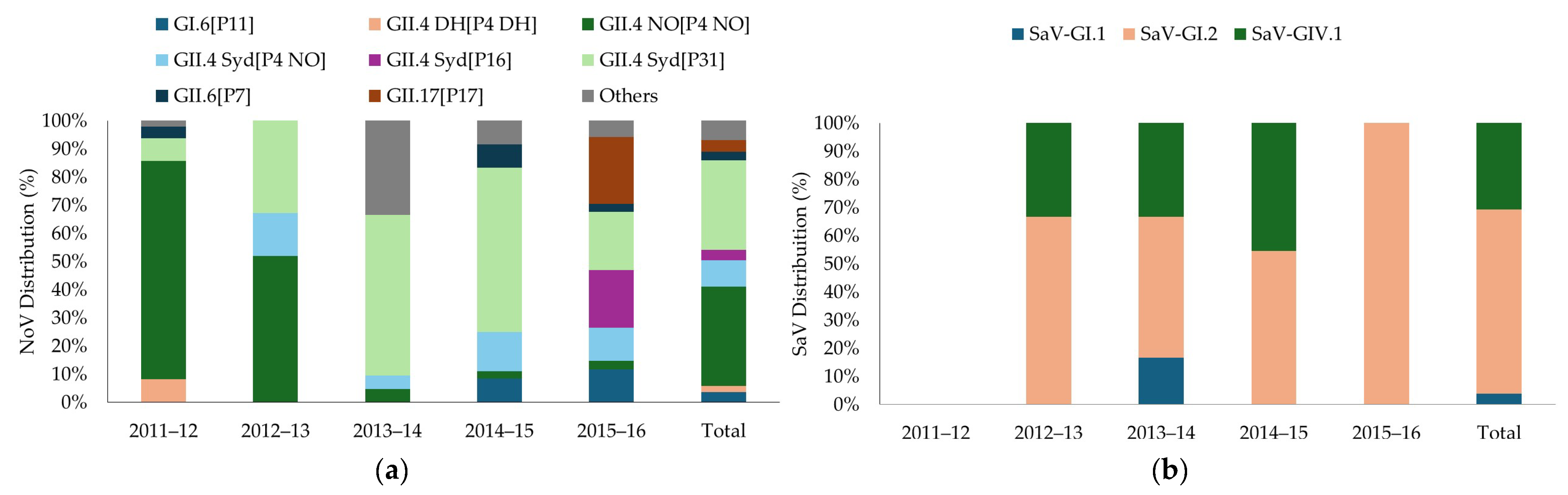 | Virus | Capsid Type | P-Type | 2011–12 | 2012–13 | 2013–14 | 2014–15 | 2015–16 | Total |