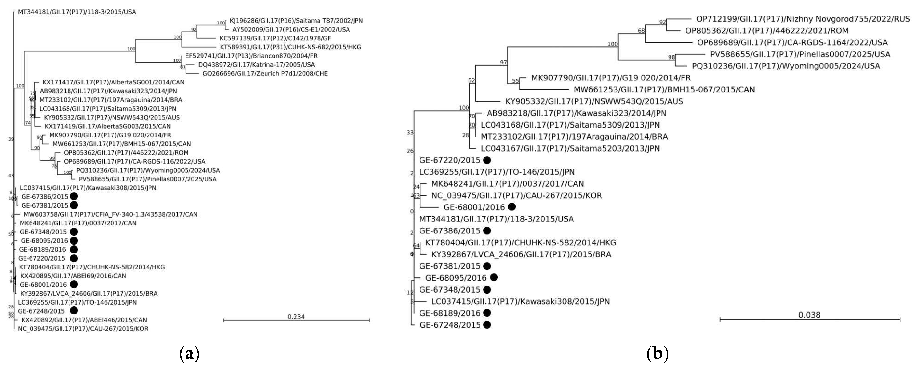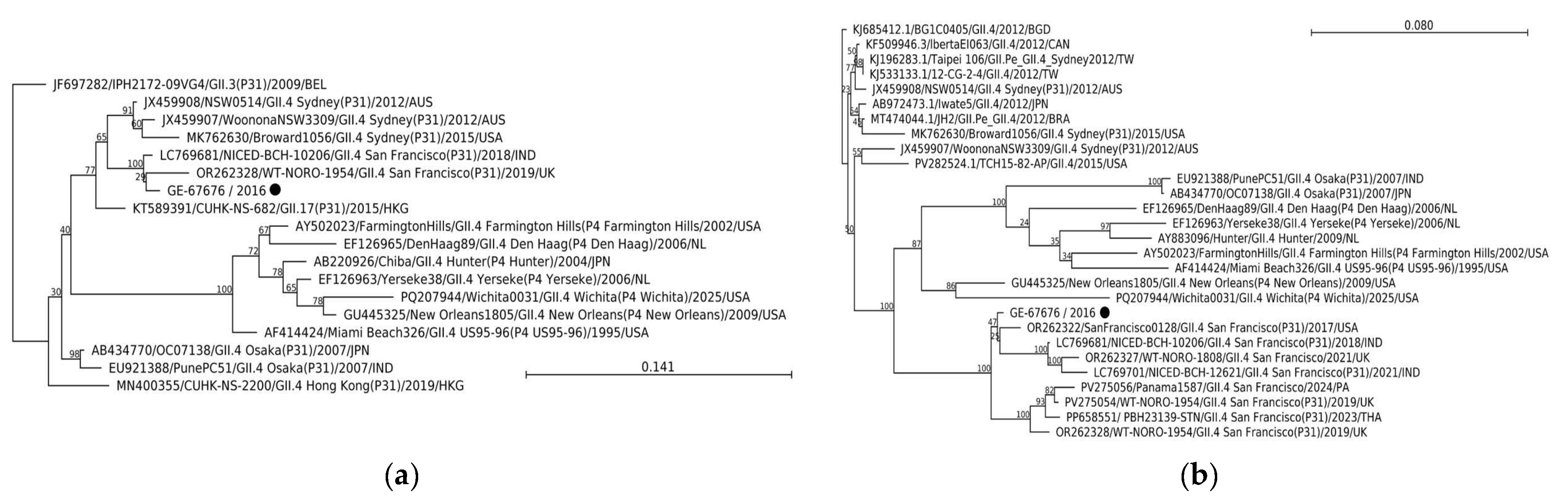 - Chan, M.C.W.; Hu, Y.; Chen, H.; Podkolzin, A.; Zaytseva, E.; Komano, J.; Sakon, N.; Poovorawan, Y.; Vongpunsawad, S.; Thanusuwannasak, T.; et al. Global Spread of Norovirus GII.17 Kawasaki 308, 2014–2016. Emerg. Infect. Dis. J. 2017, 23, 1359. [Google Scholar] [CrossRef] [PubMed]