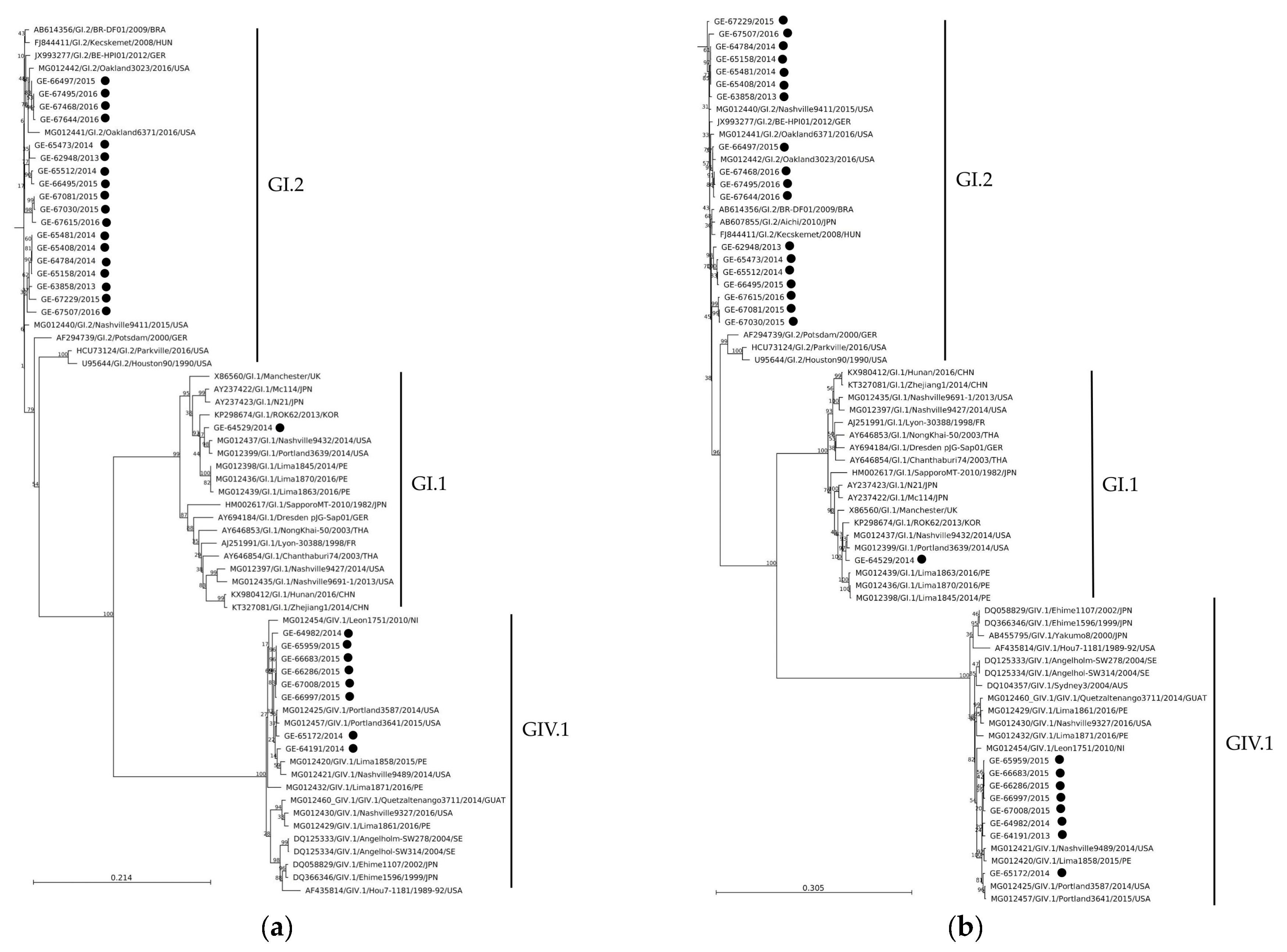 - Zhao, W.; Gao, Z.; Guo, C.; Zhang, Y.; Zhang, Y.; Wang, Q.; Yu, J. A dual typing system establishment and global diversity analysis for sapoviruses. BMC Genom. 2024, 25, 1131. [Google Scholar] [CrossRef] [PubMed]