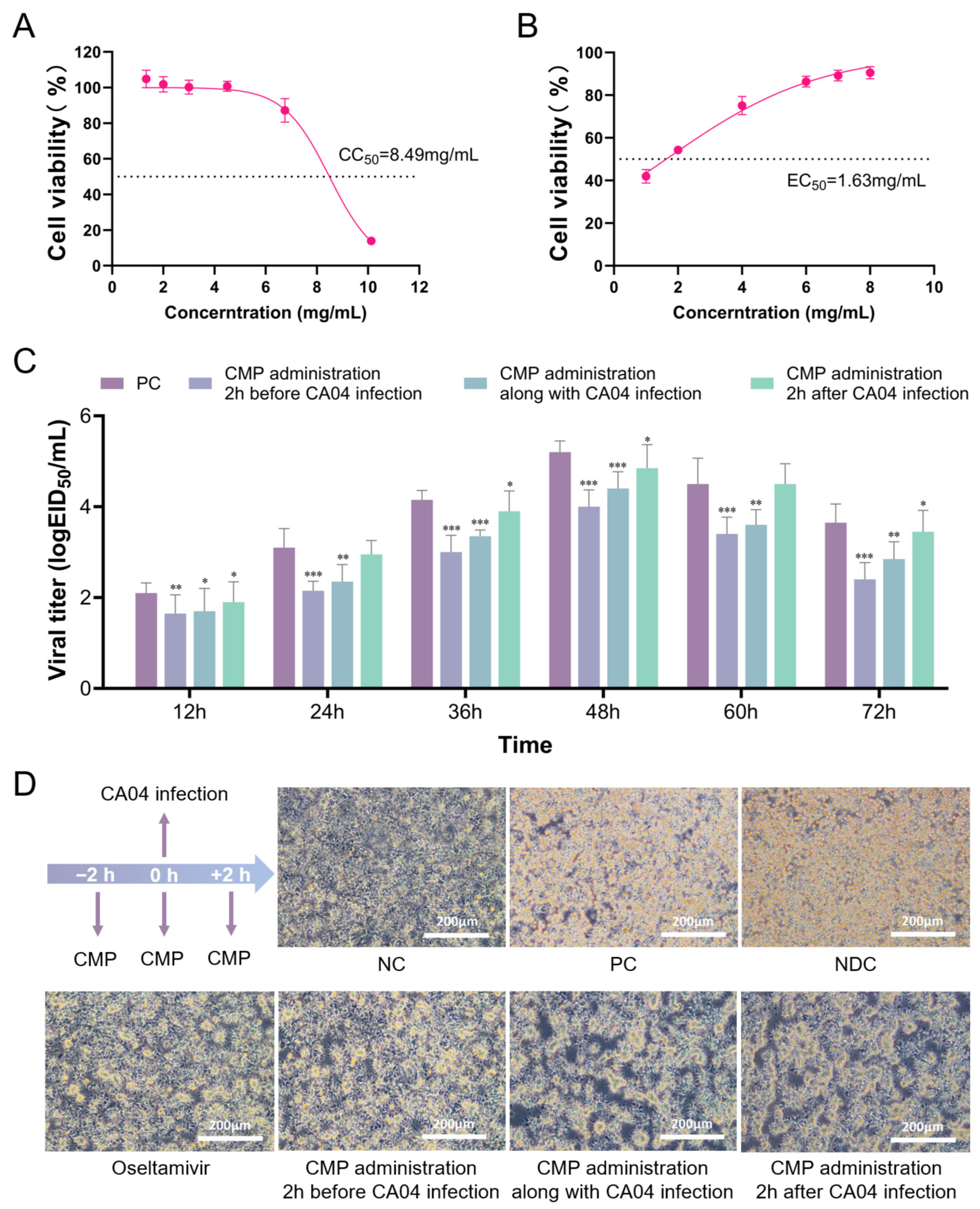 - Post-treatment: Cells were first inoculated with virus (100 TCID50; 100 µL/well) for 1 h at 37 °C Remove the viral supernatant and cover with DMEM–2% FBS. After 2 h, remove the supernatant, DMEM–2% FBS containing CMP was added and cells were incubated to 72 h.