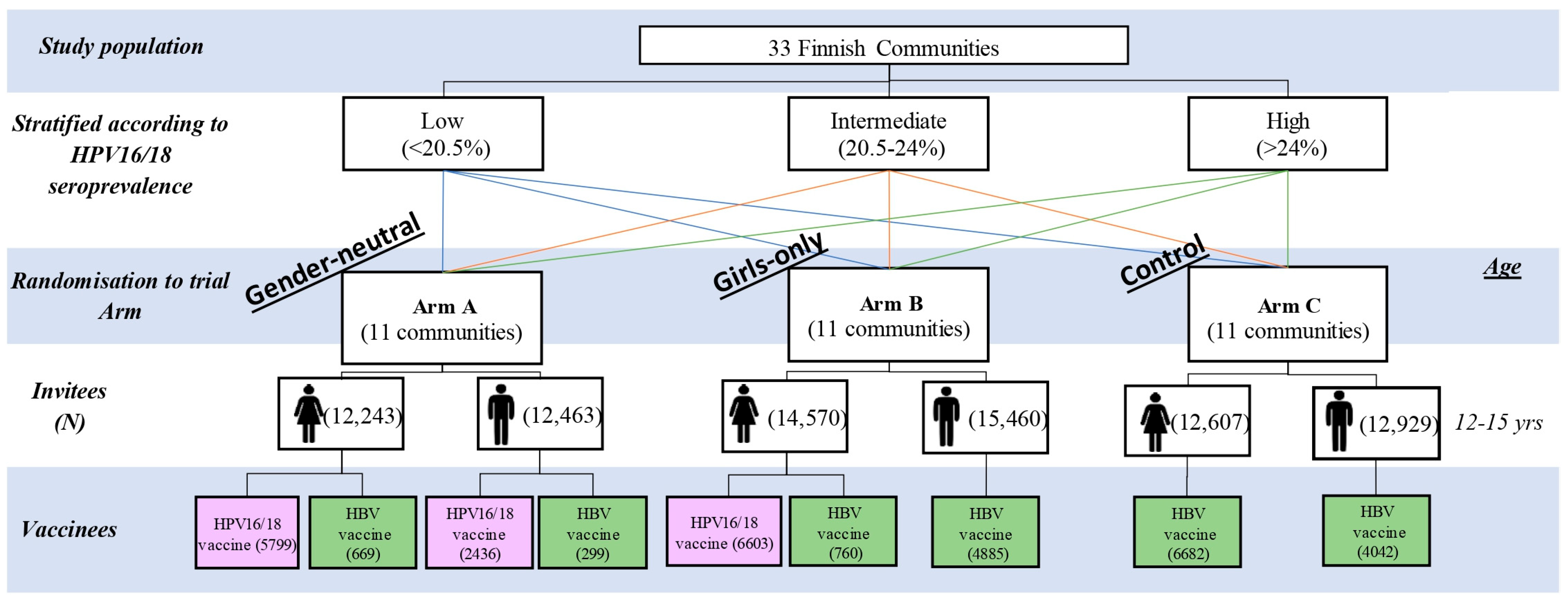 - Lehtinen, M.; Apter, D.; Baussano, I.; Eriksson, T.; Natunen, K.; Paavonen, J.; Vänskä, S.; Bi, D.; David, M.-P.; Datta, S.; et al. Characteristics of a cluster-randomized, phase IV human papillomavirus vaccination effectiveness trial. Vaccine 2015, 33, 1284–1290. [Google Scholar] [CrossRef] [PubMed]
