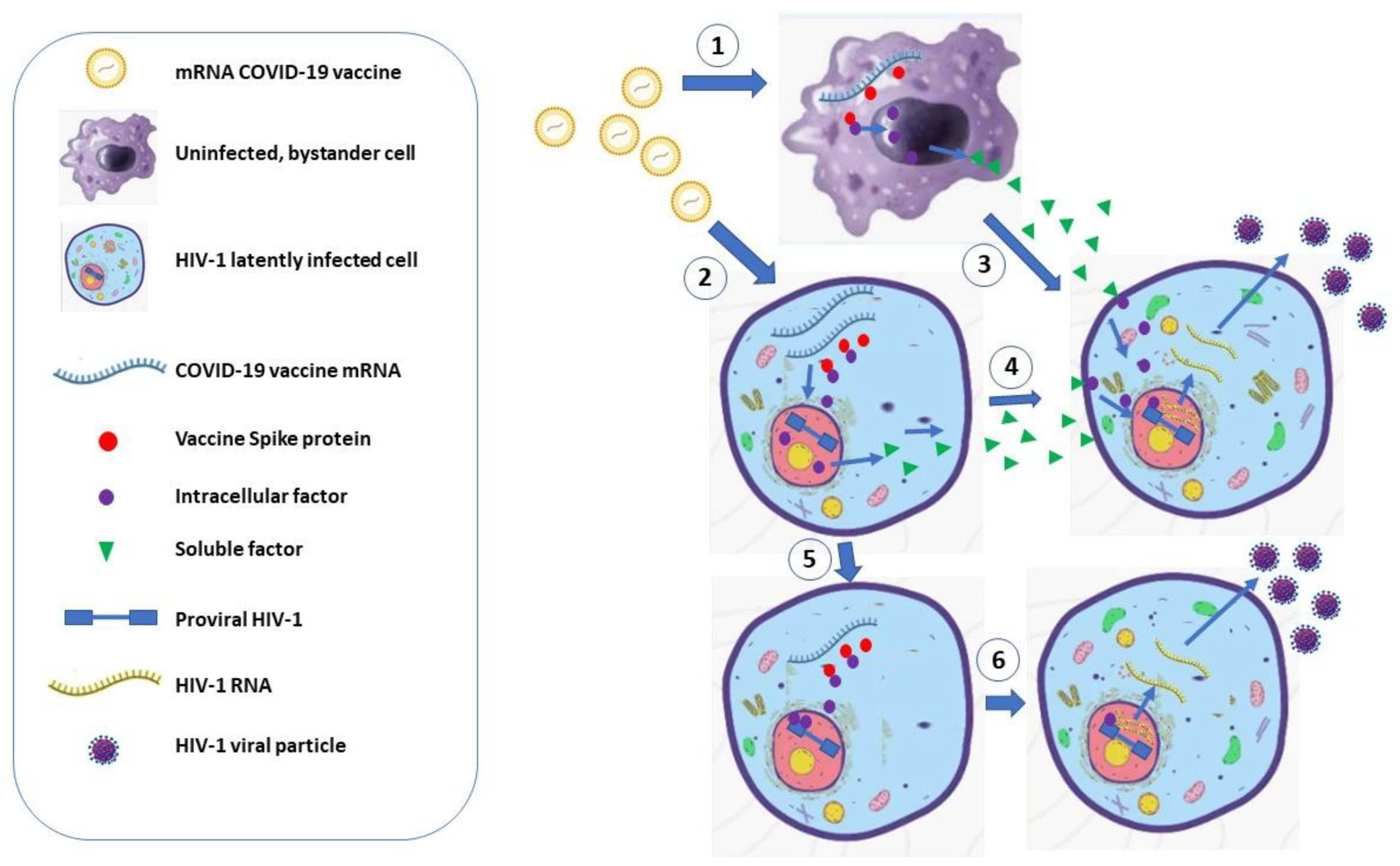 Figure 1. Possible mechanisms of HIV-1 reactivation in latently infected cells by COVID-19 vaccine mRNA. (1). After injection, lipid nanoparticle-complexed mRNA can enter either uninfected (1) or HIV-1 latently infected (2) cells. The combined effects of the mRNA molecules and the Spike protein trigger intracellular signaling, ultimately leading to the release of soluble factors (3, 4), which, in turn, can activate the HIV-1 transcription in latently infected cells through autocrine/paracrine ways. Vaccine mRNA and Spike can also act intracellularly by switching cell signaling. This leads to the induction of LTR-binding transcription factors (5), thereby promoting HIV-1 mRNA transcription and virus production (6).