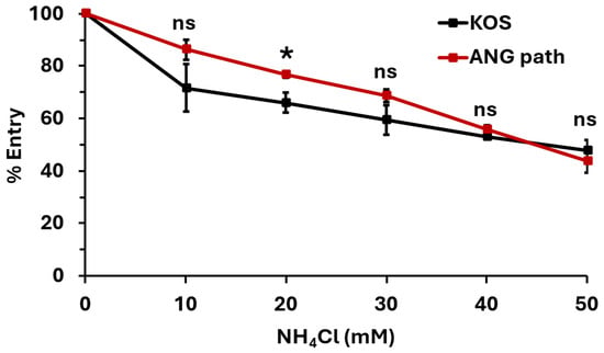 Ammonium chloride inhibited entry of both HSV-1 KOS and ANG path in a dose-dependent manner (Figure 3). This suggests that both strains are entering HaCaT cells via a low-pH-dependent pathway, consistent with pH-dependent endocytosis. The effect of ammonium chloride on entry into HaCaT cells at 4 °C was not able to be determined. The combination of ammonium chloride, citrate, and low temperature treatments was lethal to HaCaT cells. Altogether, the results suggest that 4 °C entry of HSV-1 can occur in cell types that support either pH-dependent endocytic (Figure 2 and Figure 3) or direct plasma membrane fusion pathways (Figure 1).