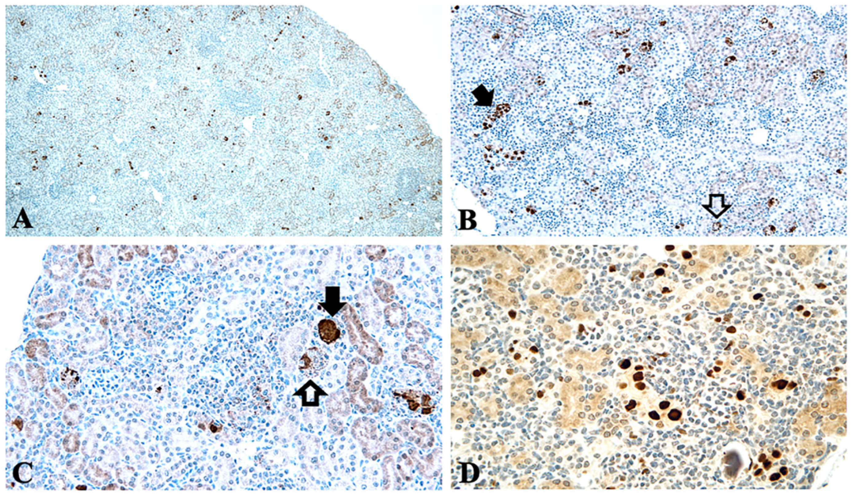 - Meehan, S.M.; Kraus, M.D.; Kadambi, P.V.; Chang, A. Nephron segment localization of polyoma virus large T antigen in renal allografts. Hum. Pathol. 2006, 37, 1400–1406. [Google Scholar] [CrossRef] [PubMed]