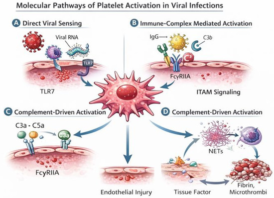 From a mechanistic perspective, platelet activation during viral infection can be triggered through multiple, often overlapping pathways. These include the recognition of viral components through platelet pattern-recognition receptors, binding of immune complexes with subsequent Fc receptor engagement, complement activation, and indirect stimulation mediated by inflammatory cytokines, neutrophil extracellular traps (NETs), endothelial injury, and thrombin generation [2,3]. Importantly, experimental evidence has demonstrated that platelet innate immune signaling pathways actively contribute to host defense and disease modulation. In murine models of viral infection, activation of platelet Toll-like receptor 7 (TLR7) promotes platelet-neutrophil interactions and significantly influences both platelet count and host survival, supporting the concept that platelets are not passive victims of infection but active participants in viral pathophysiology [1].