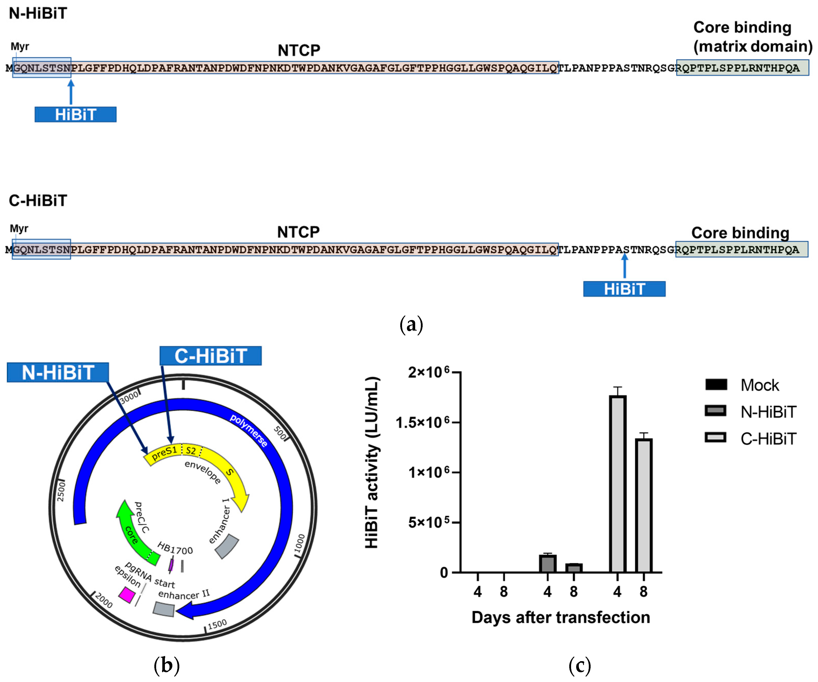 - Nakaya, Y.; Onomura, D.; Hoshi, Y.; Yamagata, T.; Morita, H.; Okamoto, H.; Murata, K. Establishment of a Hepatitis B Virus Reporter System Harboring an HiBiT-Tag in the PreS2 Region. J. Infect. Dis. 2025, 231, 204–213. [Google Scholar] [CrossRef]