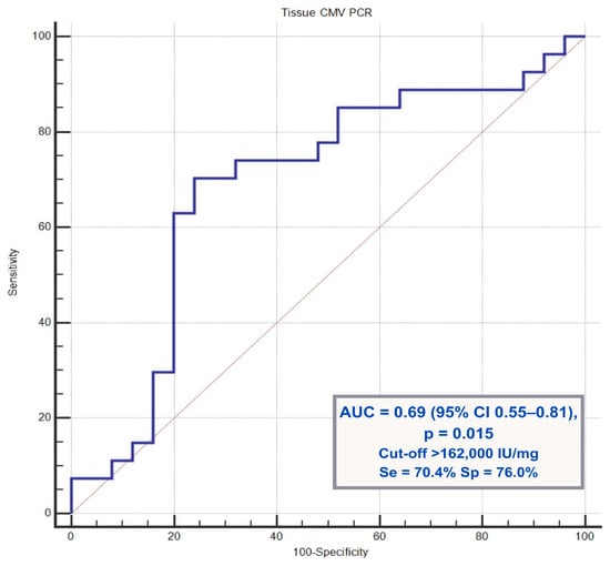 Receiver operating characteristic (ROC) curve analysis demonstrated that a tissue CMV PCR viral load cutoff value of >162,000 IU/mg predicted prolonged antiviral treatment with a sensitivity of 70.4%, specificity of 76.0%, and area under the curve (AUC) of 0.69 (p = 0.015). Figure 1 shows the ROC curve illustrating the predictive performance of the tissue CMV PCR viral load for antiviral treatment duration.