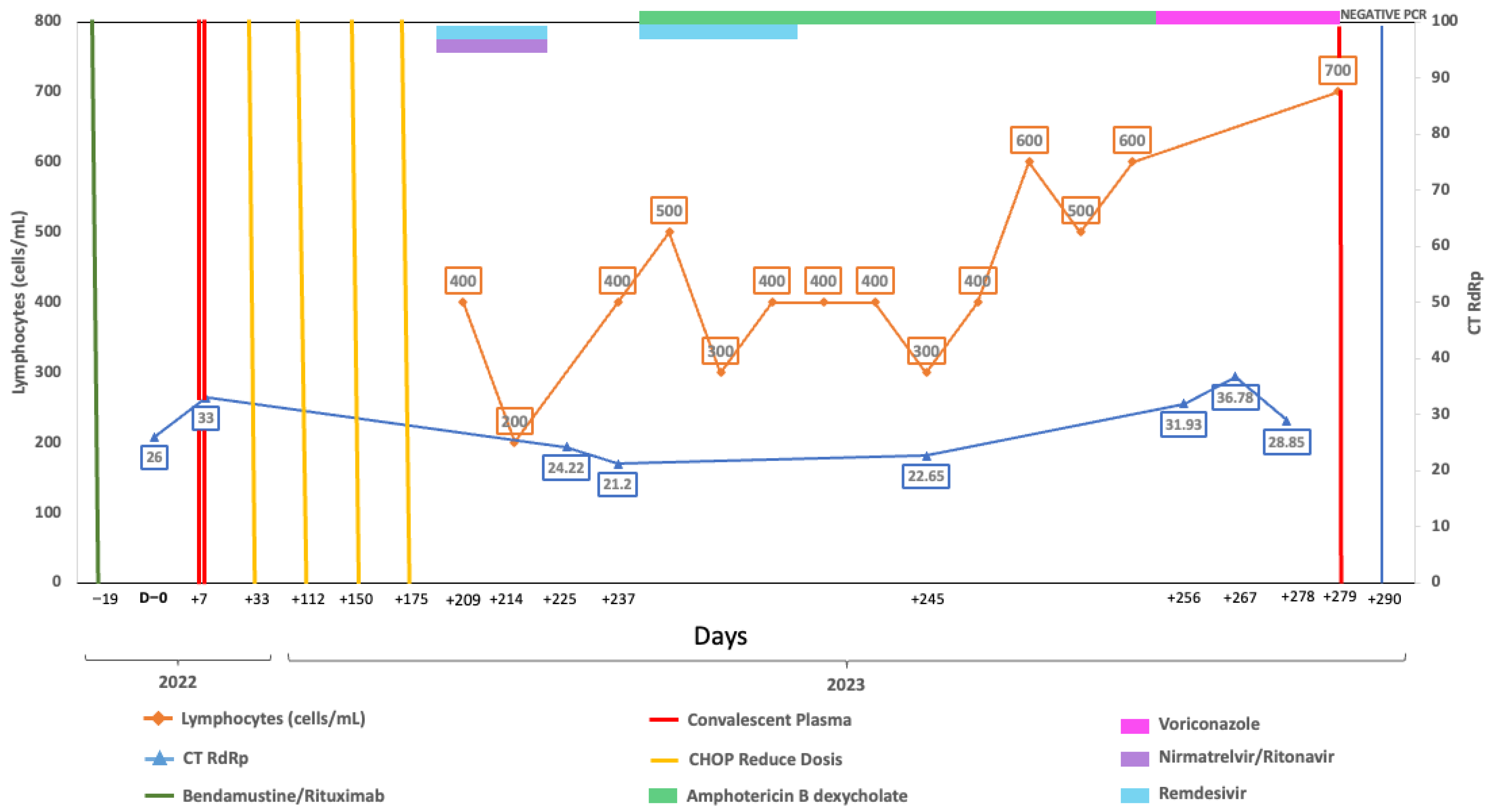 - Overbeck, V.; Taylor, B.P.; Turcinovic, J.; Qiu, X.; Schaeffer, B.; Seitz, S.; Curry, S.R.; Hanage, W.P.; Connor, J.H.; Kuppalli, K. Successful treatment of SARS-CoV-2 in an immunocompromised patient with persistent infection for 245 days: A case report. Heliyon 2024, 10, e23699. [Google Scholar] [CrossRef]