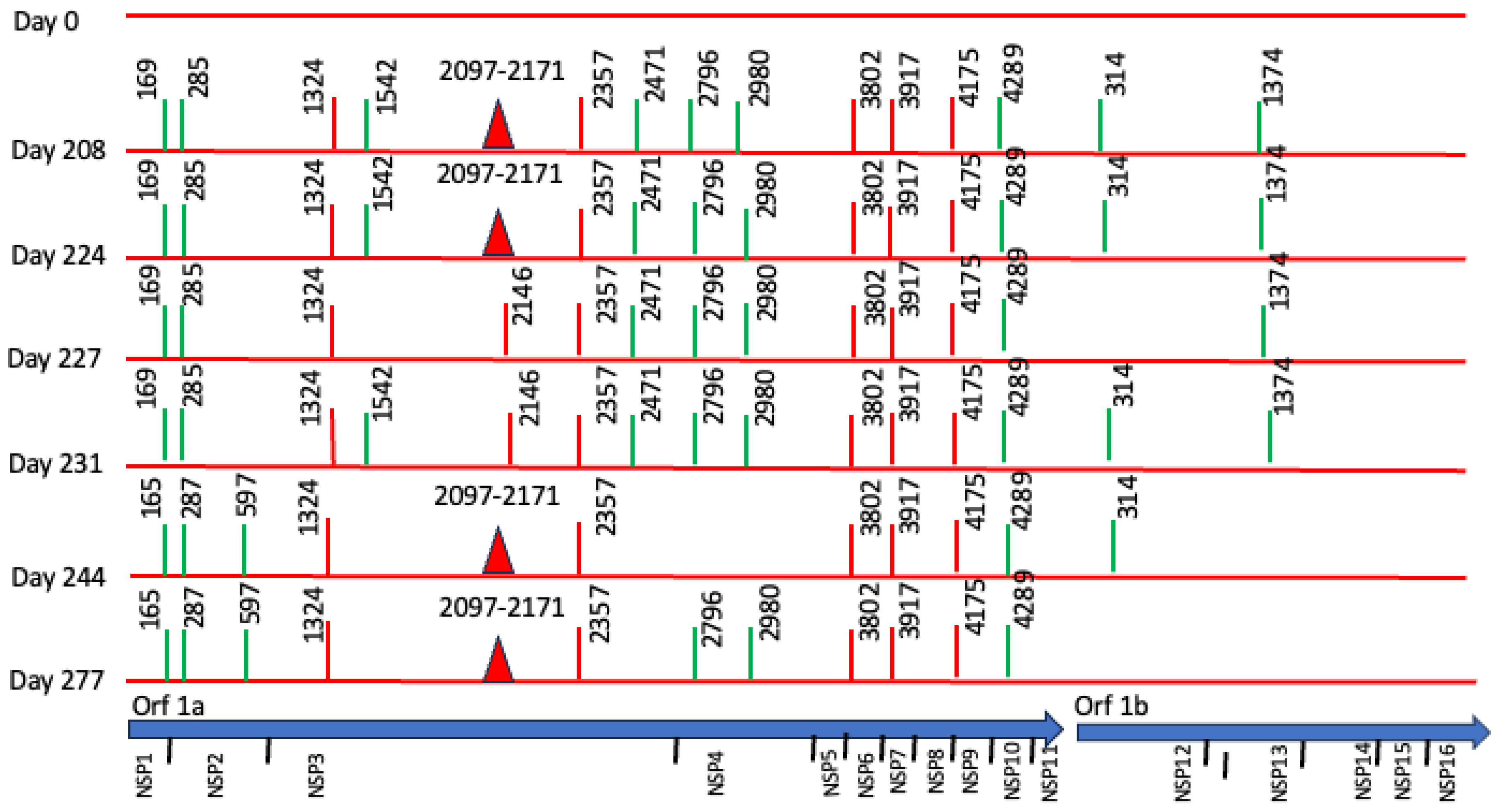 | Deletion | 6554–6776 | 2097–2171 | NSP3 |