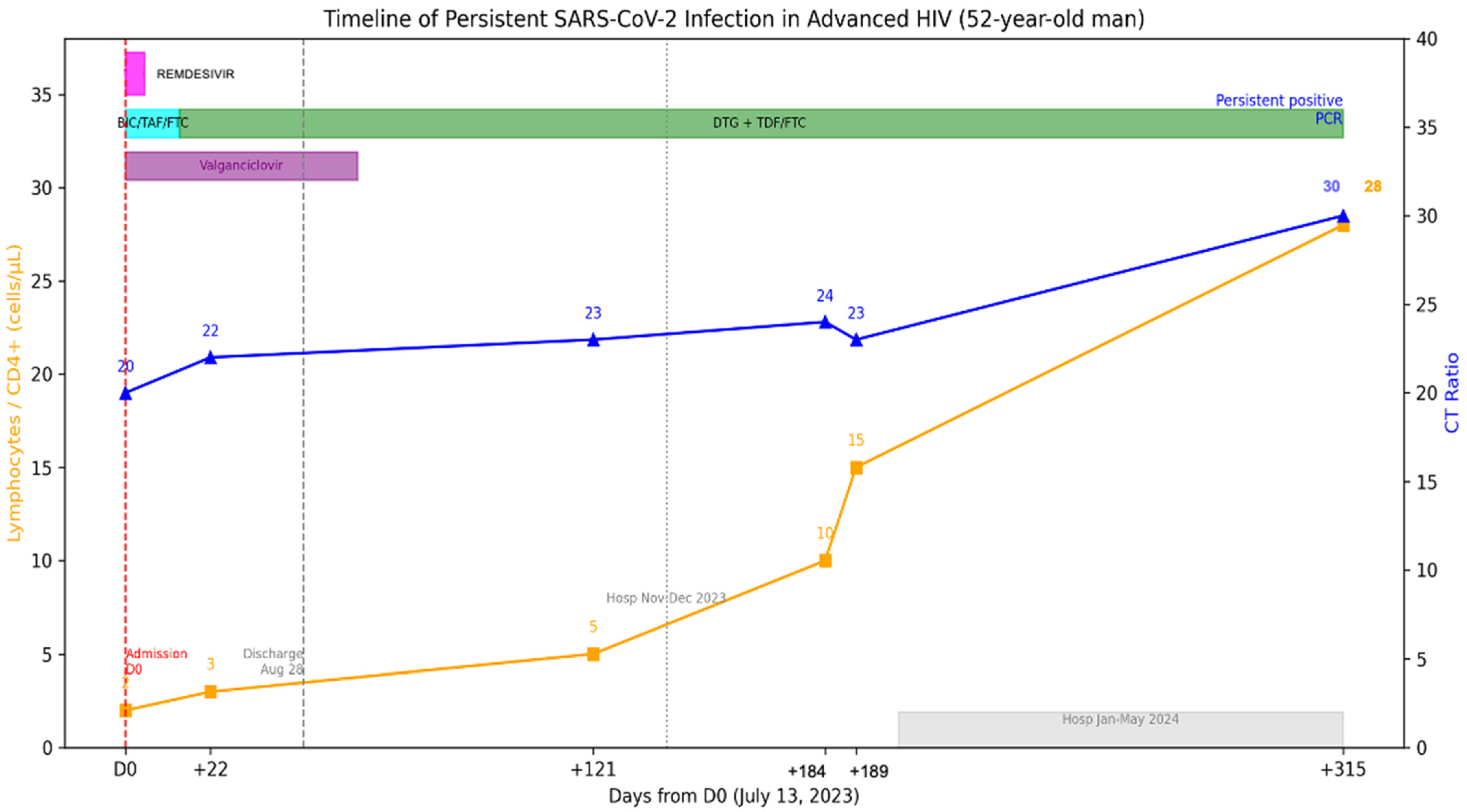 - Sepulcri, C.; Dentone, C.; Mikulska, M.; Bruzzone, B.; Lai, A.; Fenoglio, D. The Longest Persistence of Viable SARS-CoV-2 with Recurrence of Viremia and Relapsing Symptomatic COVID-19 in an Immunocompromised Patient-A Case Study. Open Forum Infect. Dis. 2022, 8, ofab217. [Google Scholar] [CrossRef]