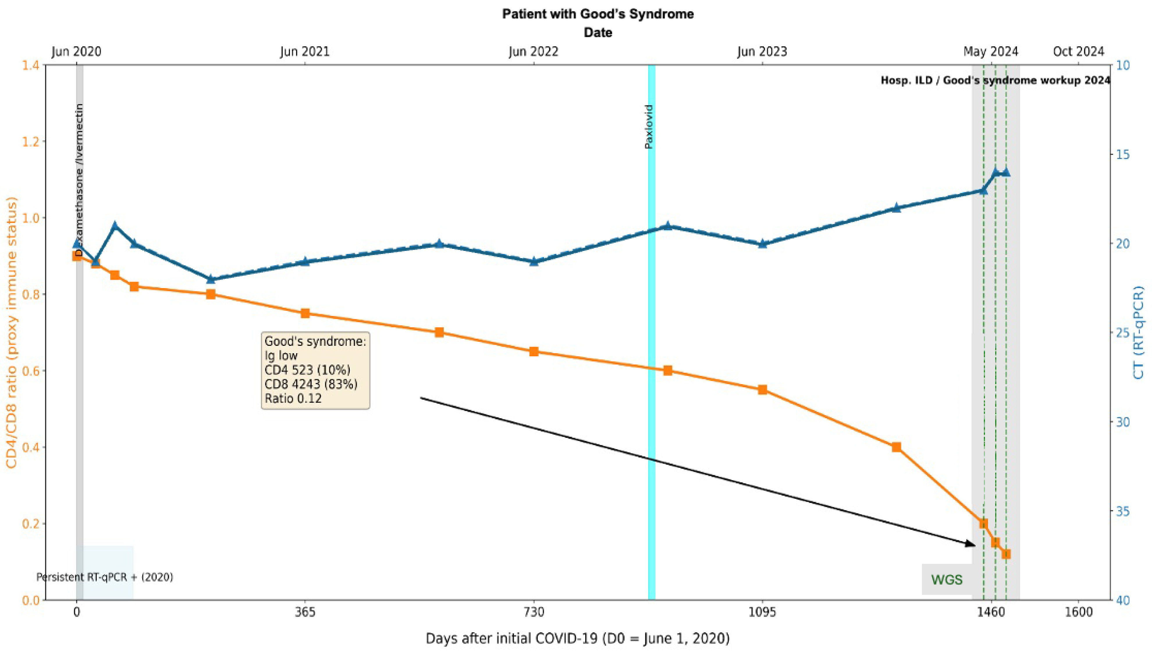 - Tabarsi, P.; Hemmatian, M.; Moradi, M. Long COVID-19 leading to Good’s syndrome diagnosis: A clinical case-report and literature review. Clin. Case Rep. 2024, 12, e8962. [Google Scholar] [CrossRef]