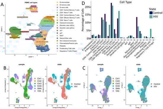 Cell cluster analysis: (A) UMAP graph of all cells after integration with a unique color designation for each annotated cluster. (B) UMAP visualization of cells before integration with a unique color for each patient. (C) UMAP visualization of cells after integration with separate colors for HIV status (graph on the right). (D) Proportion of cells in individual PBMCs populations from the total number of analyzed PBMCs for HIV-positive and HIV-negative people. When comparing the proportions, no statistically significant differences were found after the Bonferroni correction.