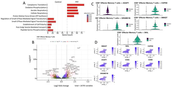 Transcriptomic profile of CD8+ Tem cells: (A) GO enrichment analysis for control and HIV-positive cohorts. (B) A volcano-plot demonstrating highly and lowly expressed genes in the CD8+ Tem cells of HIV-positive cohort showing statistically significant differential expression compared to the control cohort. (C) Expression levels of key genes across cohorts. (D) Expression levels of key genes within the HIV-positive CD8+ Tem cell cluster.