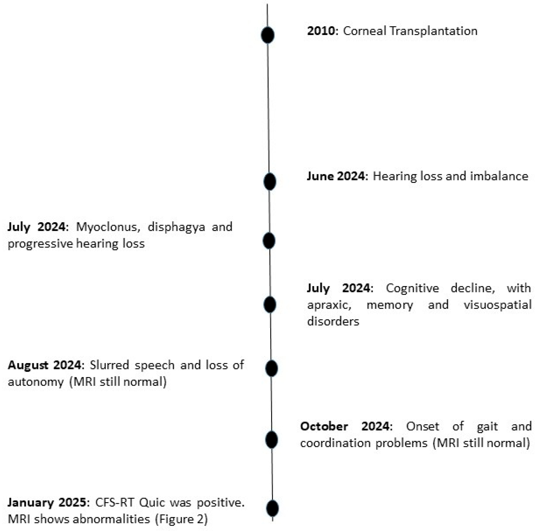- A documented history of iatrogenic exposure (e.g., cadaveric human growth hormone therapy, dura mater grafts, contaminated neurosurgical instruments, corneal transplantation, or blood transfusion from an infected donor).