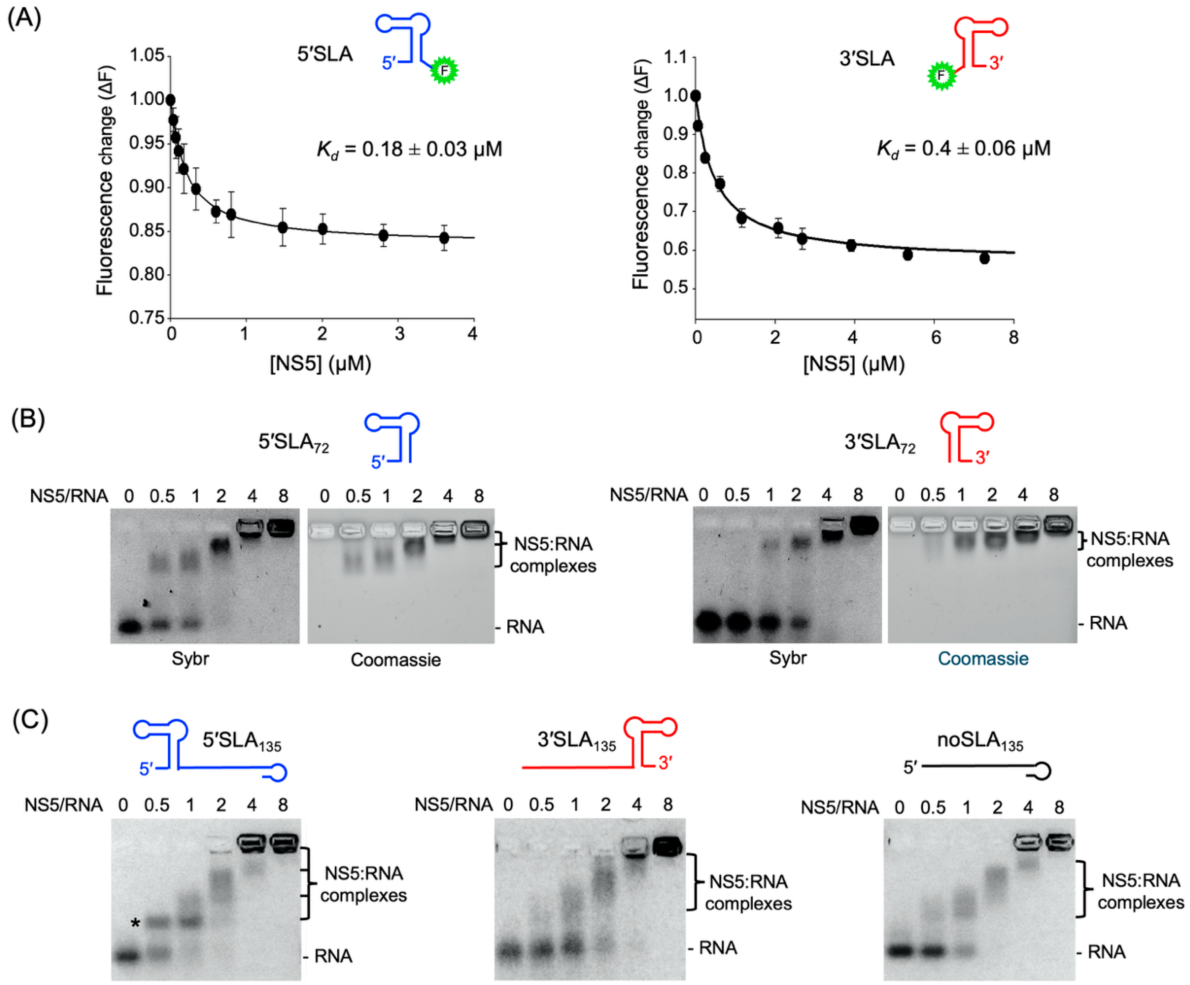 3.2. NS5 Preferentially Binds to 5′SLA in the Positive Strand over 3′SLA in the Negative Strand