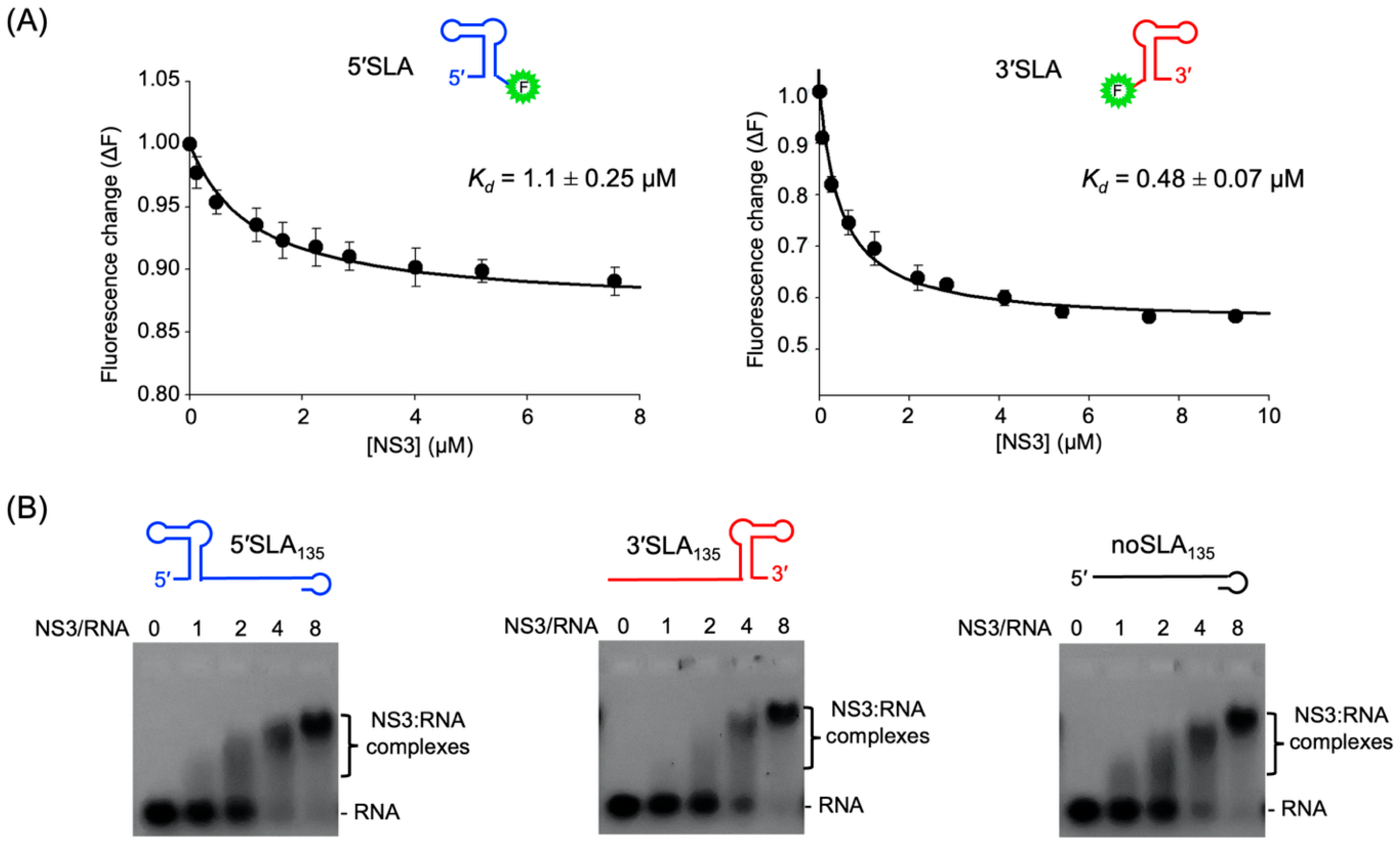 3.3. NS3 Does Not Distinguish Between 5′SLA or 3′SLA for Binding