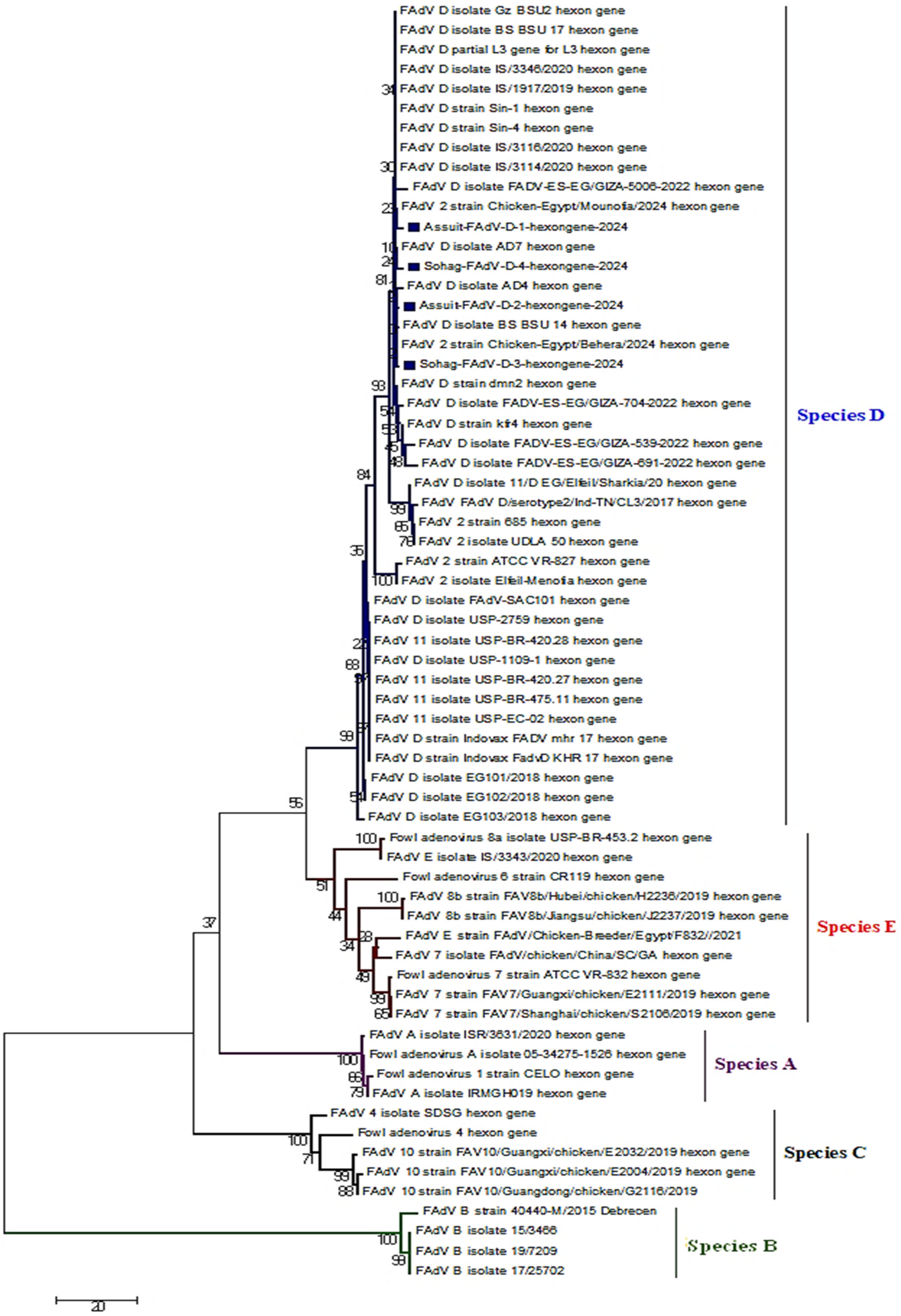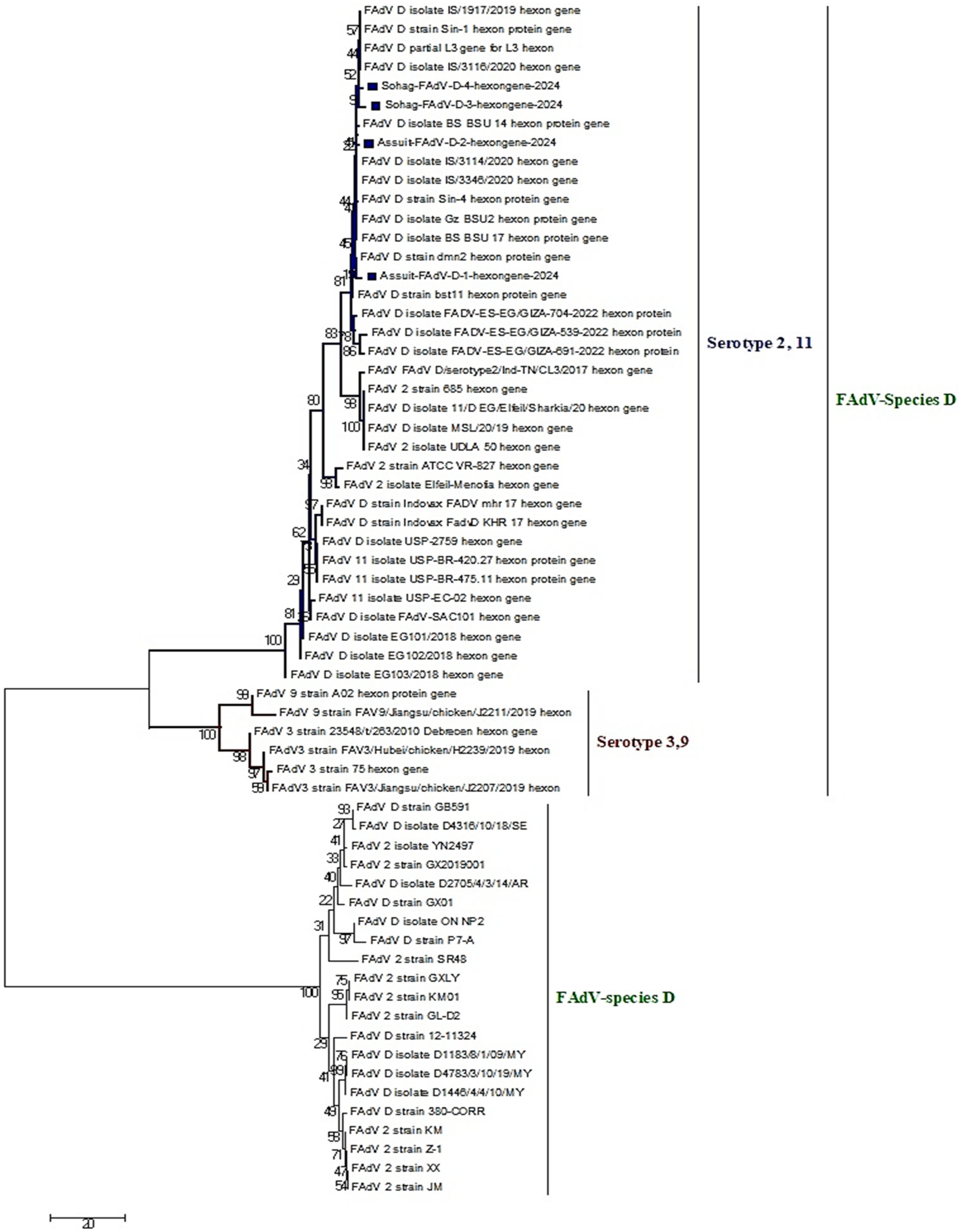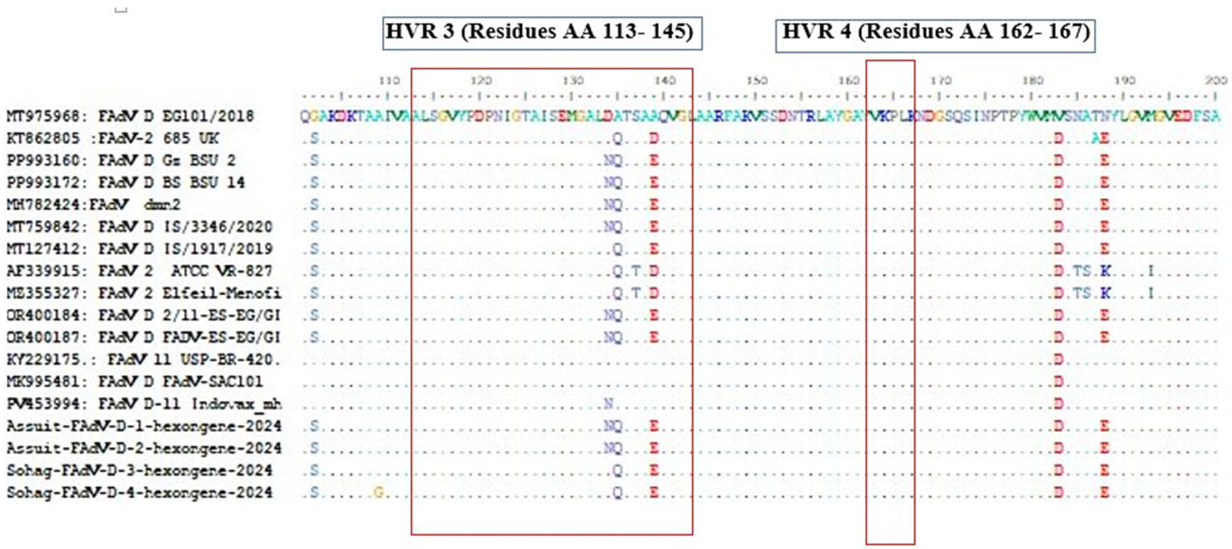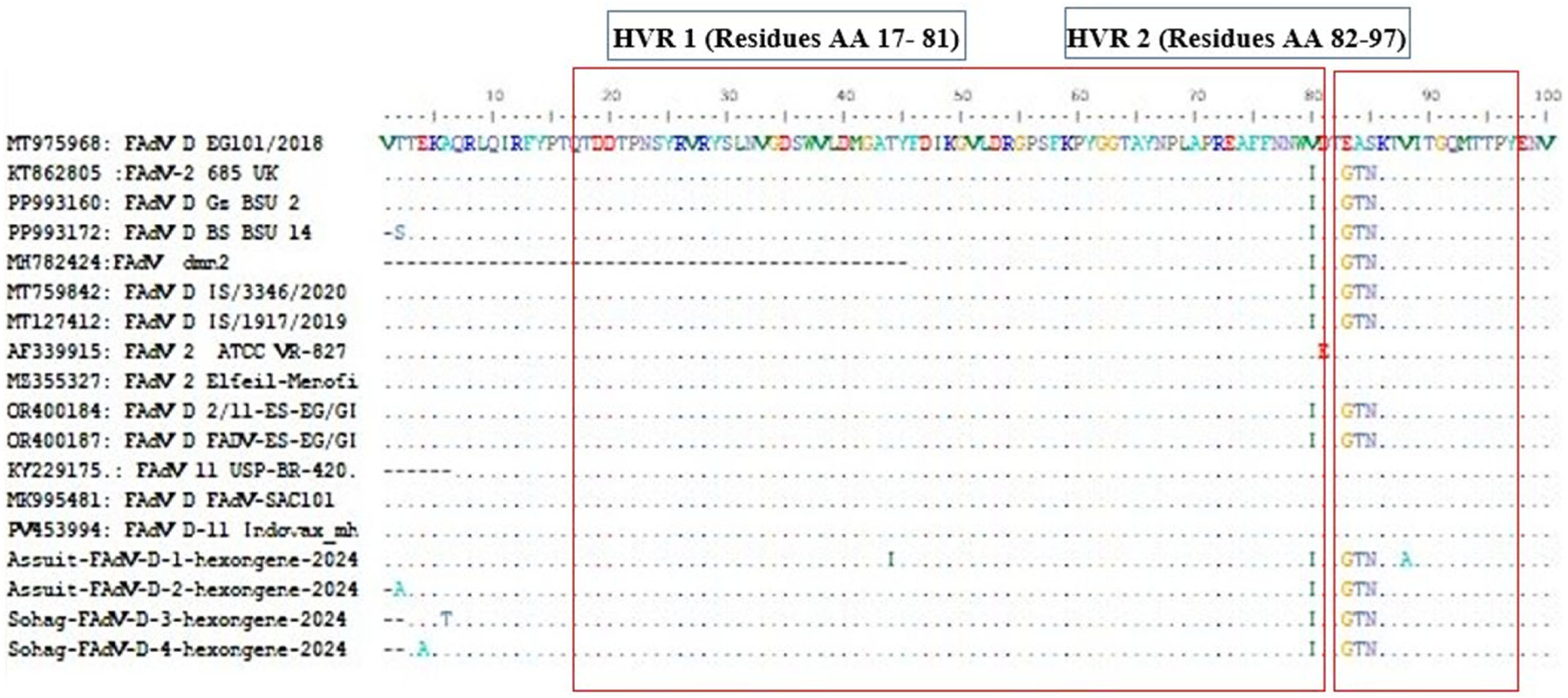 | Sequence | KT862805 | MT975968 | PP993160 | PP993172 | MH782424 | MT127412 | MT759842 | AF339915 | MZ355327 | PV243152 | OR400184 | OR400187 | KY229175 | MK995481 | PV453994 | MW217576 | ON502598 | ON502594 | KY229177 | ON502594 | Assuit-FAdV-D-1-hexongene-2024 | Assuit-FAdV-D-2-hexongene-2024 | Sohag-FAdV-D-3-hexongene-2024 | Sohag-FAdV-D-4-hexongene-2024 | |