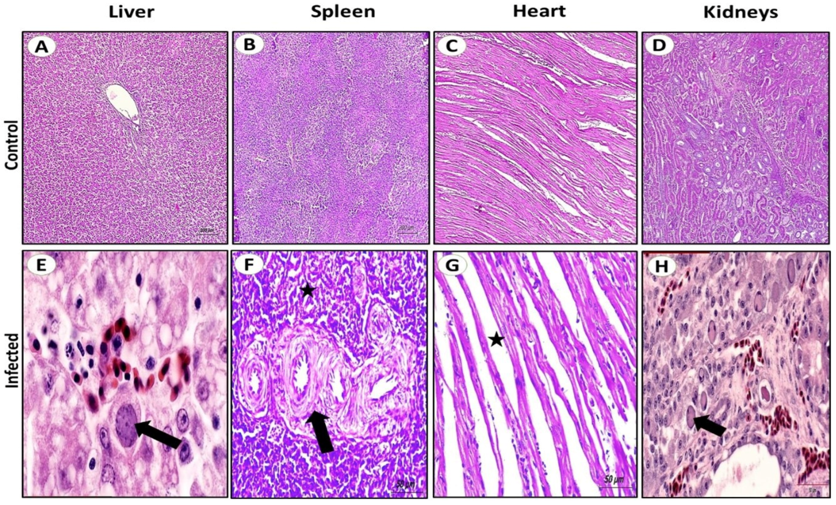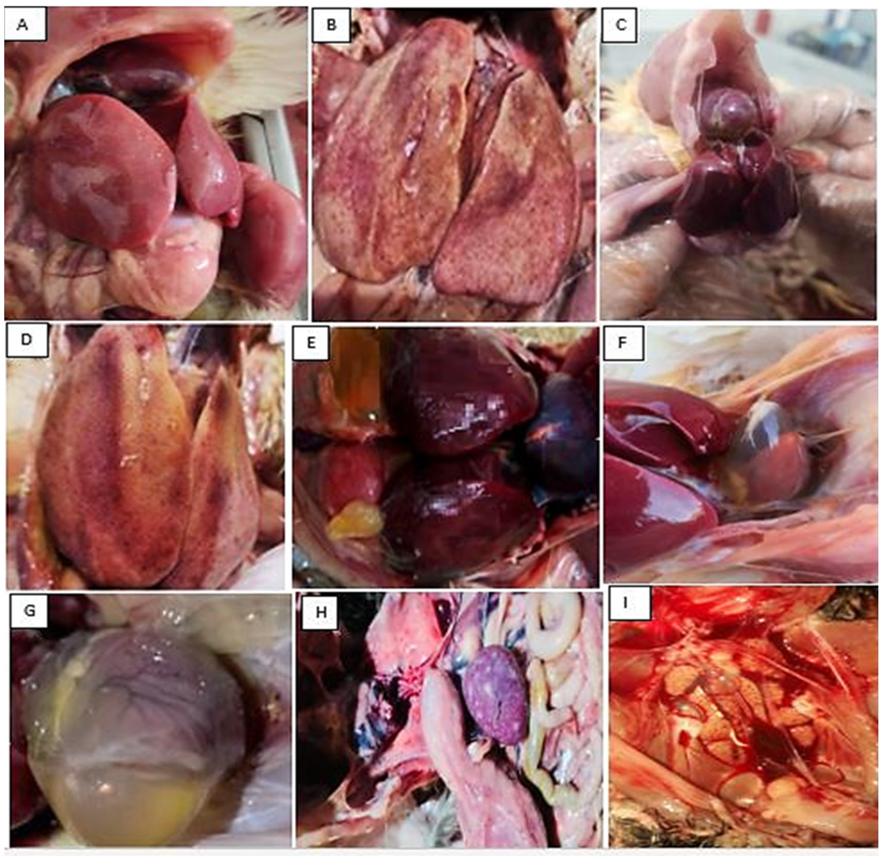 | Assiut | 65 | 2024 | Broilers, 1–33 days | 5000–10,000 | 3–15 | liver | spleen | Severe respiratory manifestations, depression, body weight loss, and watery diarrhea, enlarged, friable livers with subcapsular ecchymotic hemorrhages, accumulated yellow gelatinous fluid in the pericardial sac, ascites, hepatitis, hydropericardium, peritonitis, pneumonia, and tracheitis |