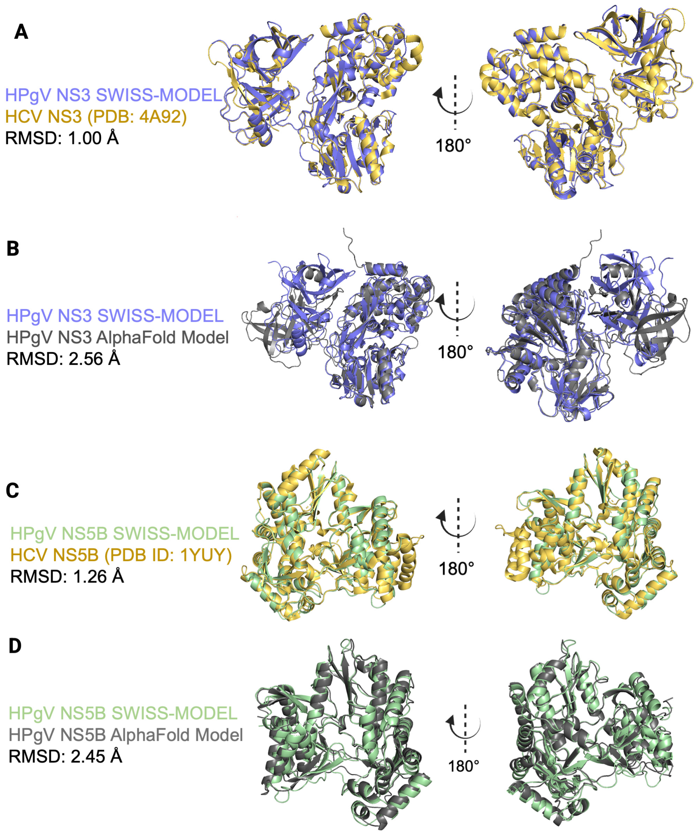 | HPgV NS5B SWISS-MODEL | HPgV NS5B AlphaFold Model | HCV NS5B (PDB ID: 1YUY) | ||