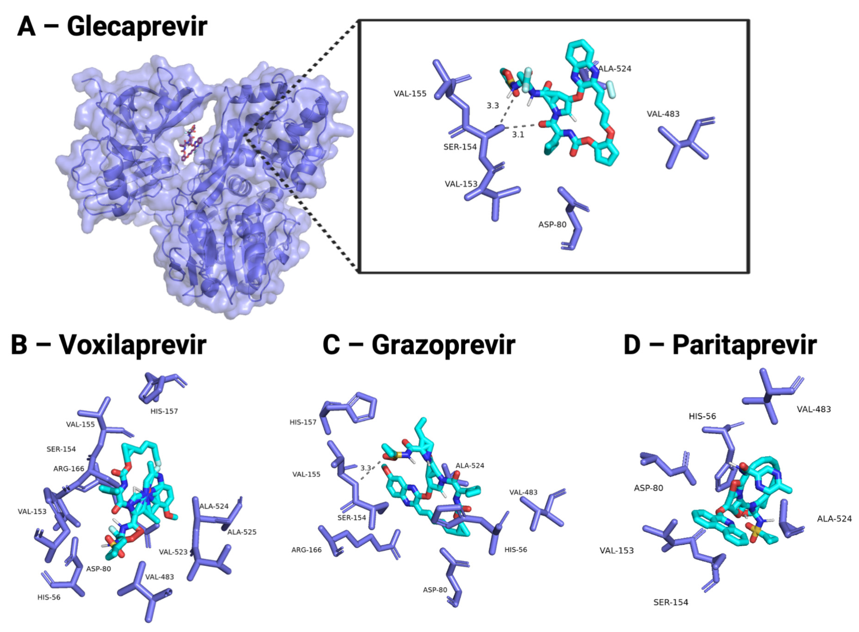 | Grazoprevir | NS3/4A | −9.8 | −7.6 | −11.1 |