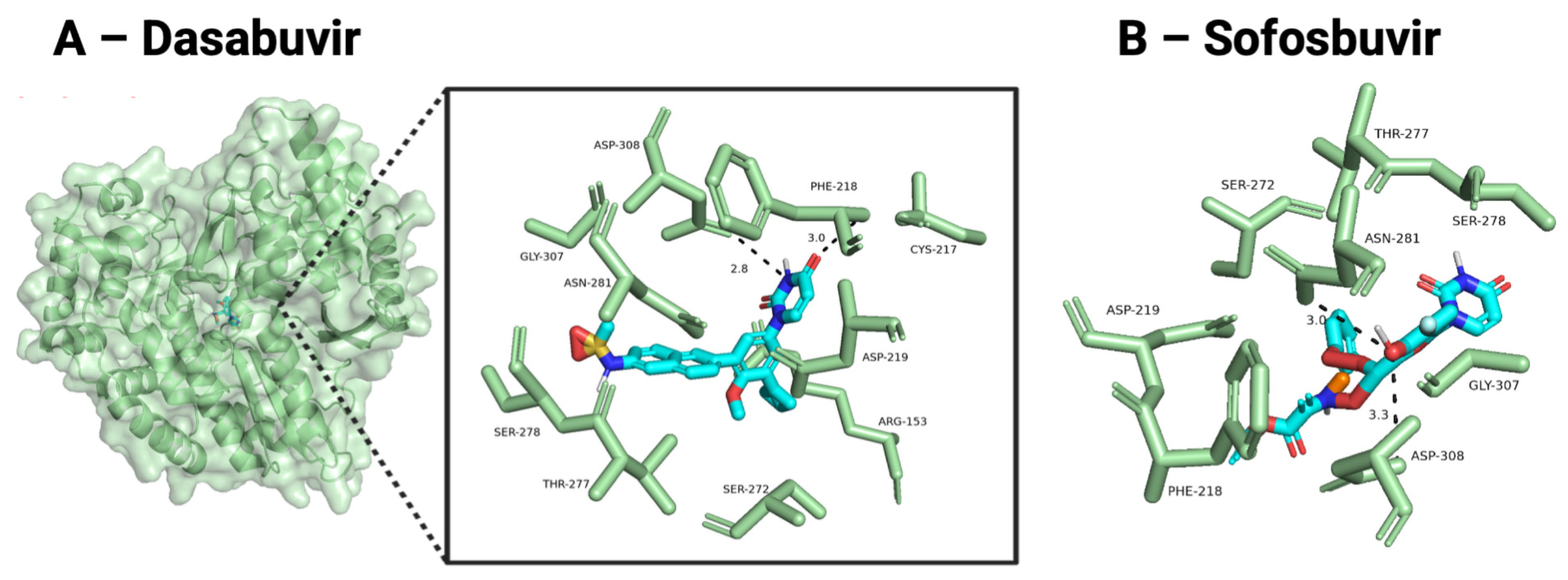 | Sofosbuvir | NS5B | −7.2 | −7.0 | −7.5 |