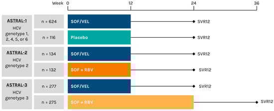 HCV RNA data from patients enrolled in ASTRAL-1 (NCT02201940), ASTRAL-2 (NCT02220998), and ASTRAL-3 (NCT02201953) were evaluated. Patients in ASTRAL-1 were enrolled at 81 sites in the United States, Canada, Europe, and Hong Kong [39]. ASTRAL-2 enrolled patients at 51 sites in the United States, and ASTRAL-3 enrolled patients at 76 sites in the United States, Canada, Europe, Australia, and New Zealand [40]. The study designs are shown in Figure 1; detailed methodologies for each study were published previously [39,40]. Participants in ASTRAL-4, which enrolled patients with decompensated cirrhosis [41], and ASTRAL-5, which enrolled patients with HCV and HIV-1 coinfection [42], were excluded. SVR was defined as an HCV RNA level below the lower limit of quantitation (15 IU/mL) 12 weeks after treatment, as measured by the COBAS AmpliPrep/COBAS TaqMan HCV Quantitative Test, version 2.0 (Roche Molecular Diagnostics, Pleasanton, CA, USA).