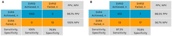 Concordance of sustained virologic response (SVR) at 4 weeks post-treatment (SVR4) and at 12 weeks post-treatment (SVR12) in the ASTRAL studies (A) and in the Real-World Hepatitis Surveillance Program (B). NPV, negative predictive value; PPV, positive predictive value.