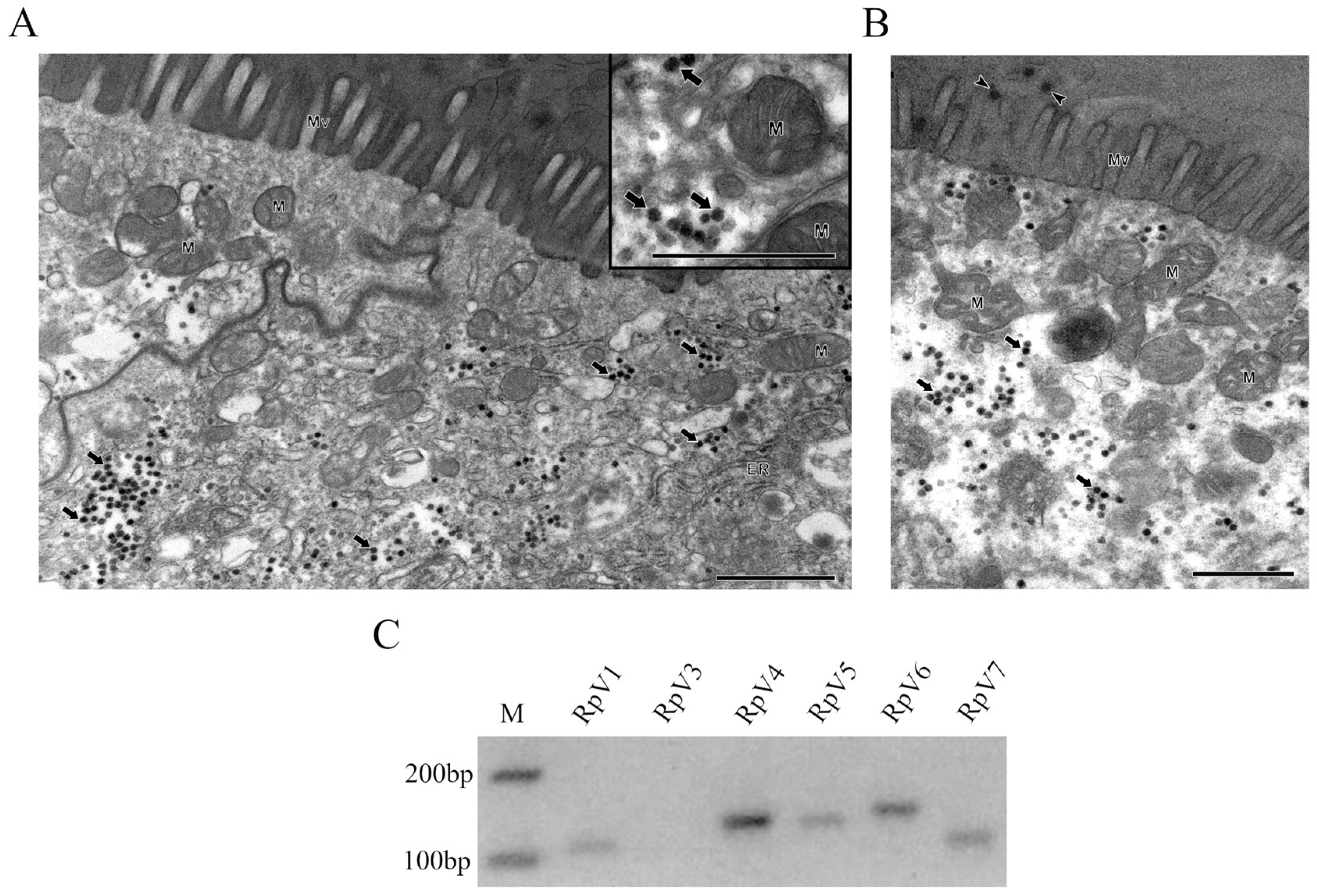 3.1. Transmission Electron Microscopy Analysis Reveals Viral Particles in R. prolixus Anterior Midgut