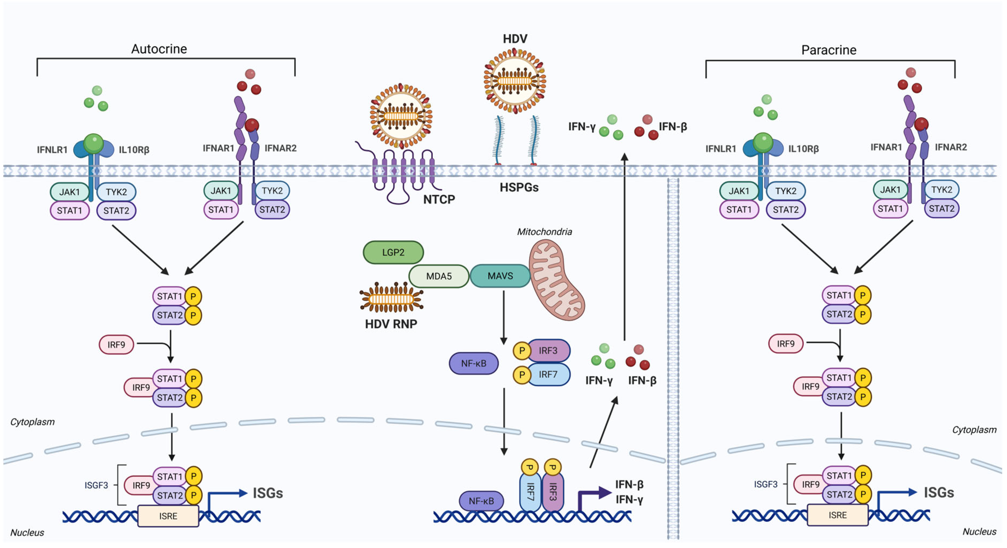 - Zhang, Z.; Ni, Y.; Lempp, F.A.; Walter, L.; Mutz, P.; Bartenschlager, R.; Urban, S. Hepatitis D virus-induced interferon response and administered interferons control cell division-mediated virus spread. J. Hepatol. 2022, 77, 957–966. [Google Scholar] [CrossRef] [PubMed]