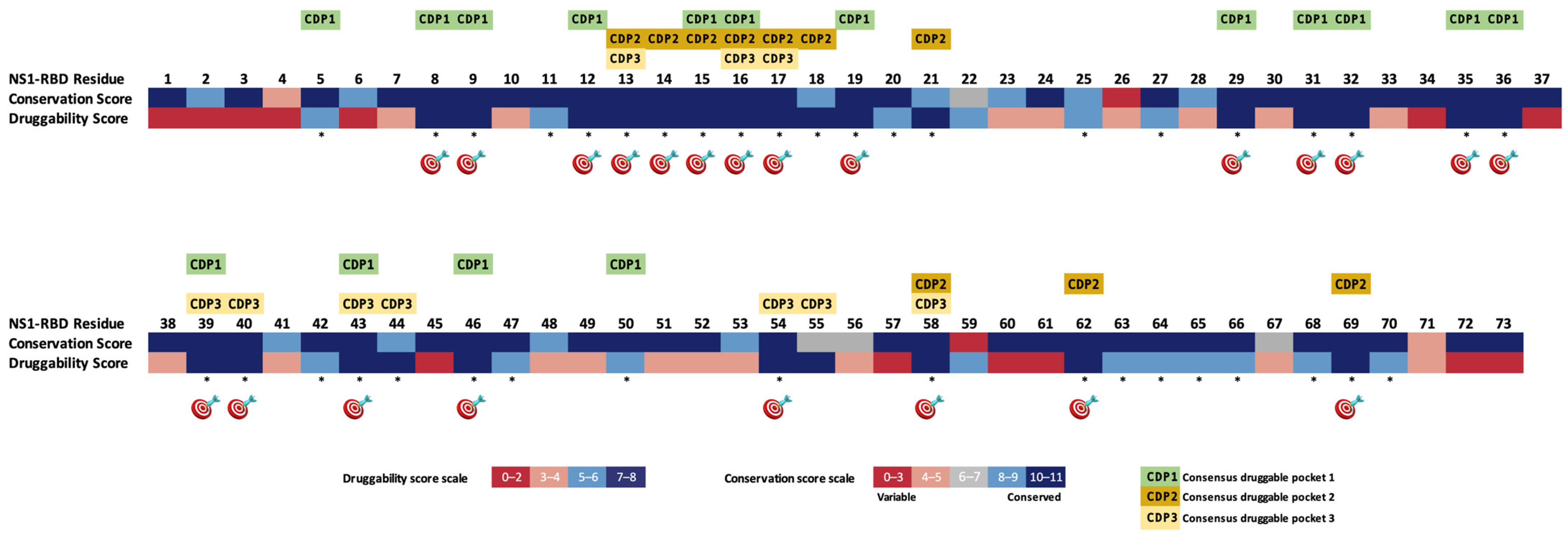 3.1. The Influenza NS1-RBD Exhibits Conserved Druggable Pockets and Top-Ranked Hot Spots