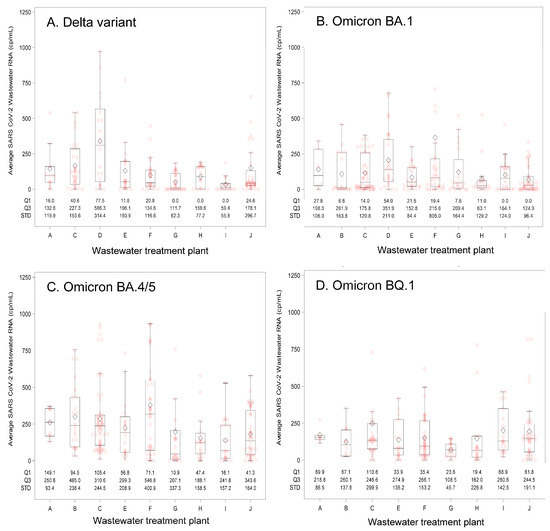 Summary of wastewater SARS-CoV-2 RNA concentrations by wastewater treatment plant (A–J) and predominant circulating SARS-CoV-2 variant. Predominant circulating variants and time periods were: (A) Delta variant: 23 May 2021–31 December 2021; (B) Omicron BA.1 variant: 1 January 2022–31 May 2022; (C) Omicron BA.4/5 variant: 1 June 2022–30 October 2022; and (D) Omicron BQ.1 variant: 1 November 2022–17 April 2023. The box and whisker plot lower bound of the box represents quartile 1 (25th percentile) and upper bound quartile 3 (75th percentile) of the data, which together describe the interquartile range. The line bisecting the box represents the 50th percentile (median value). Pink circles indicate individual measured values and diamonds represent the mean value. The whiskers extend 1.5 times the interquartile range, and dots located outside of the end of the whisker are considered outlier values. Abbreviations: cp/mL = copies per milliliter; Q1 = first quartile; Q3 = third quartile; STD = standard deviation.