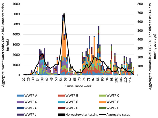 There are strengths and limitations of this study that may affect the interpretation of the results. The evaluation included 2 years of wastewater surveillance data from 10 independent WWTPs, resulting in a robust wastewater data set that spanned the circulation of several SARS-CoV-2 variants. COVID-19 case counts came from public data, which underestimated the true number of COVID-19 infections because it did not include home test results and individuals who did not get tested for COVID-19. Additionally, COVID-19 case data were reported at the county level, which did not necessarily match WWTP service boundaries, and several WWTPs received sewage from households in adjacent counties. We adjusted our analyses to account for the differences in population size between WWTP users and county populations.