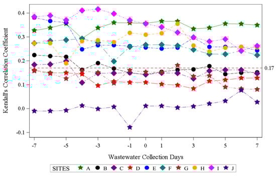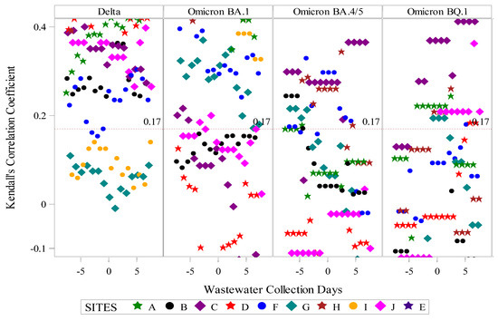 Assessment of aggregate wastewater SARS-CoV-2 concentrations and reported COVID-19 cases over time demonstrated a clear visual correlation between the two sources of COVID-19 surveillance data (Figure 2). Site-specific wastewater and clinical case epidemiologic curves showed more variable visual correlations (Figure S1). A time-shifted correlational analysis by WWTP (Figure 3) showed variable correlation between the wastewater signal and COVID-19 case counts by site. Most sites (7/10) showed statistically significant correlations across most of the time shifts. At most locations, correlations were stronger (higher Kendall’s correlation coefficient) when the wastewater data was time-shifted to lead the case data. Correlations were also stronger during the Delta variant-predominant period (Figure 4) than the Omicron variant time periods, and the poorest site level correlations were observed during the Omicron BQ.1 period.
