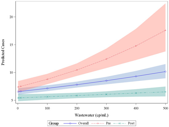 where is an intercept and represents the effect of site A, , …, represent the effects of each corresponding site, , …, are the binary covariates corresponding to each site, β is the effect corresponding to wastewater, and X is the wastewater SARS-CoV-2 RNA concentration. We built models that used all the available data (overall), the early pandemic data (pre), and the later pandemic data (post) to predict the number of clinical cases corresponding to each observed wastewater RNA data point. All hypotheses were tested at the standard 5% significance level. Statistical analyses were conducted using SAS version 9.4 (SAS Institute Inc., Cary, NC, USA).