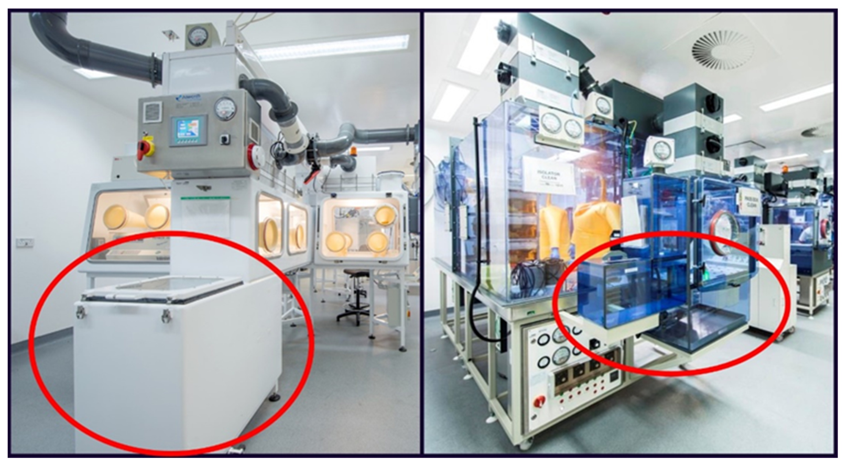 Figure 1) and are an integral part of removing samples from the CL4 containment system and/or from the CL4 laboratories. The dunk tank from the primary containment systems to the room are used for removal of samples from the cabinet line or isolator, either for movement to connecting CL4 laboratories or for storage within the CL4 laboratory. The room dunk tanks are for removal of samples from the secondary containment area (the laboratory), for movement to non-connected laboratories, storage outside the laboratory, or for samples that are being moved to lower containment if using approved inactivation methods. Both dunk tanks are filled with the same concentration of the same disinfectant, and all samples leaving the laboratory would have gone through two rounds of immersion in dunk tanks. Due to the large volumes (>300 L per dunk tank) and the specialist waste disposal required for large volumes of disinfectant, it is impractical to change the disinfectant in dunk tanks daily or frequently, and therefore disinfectants with long-term efficacy that do not need to be prepared daily are essential. Disinfectants that remain active over long periods may also be useful for suited laboratories where they are frequently held in large volumes to be used for decontamination of positive pressure suits in a chemical shower system. Disinfectant with long-term efficacy may also be useful as part of emergency spill kits.