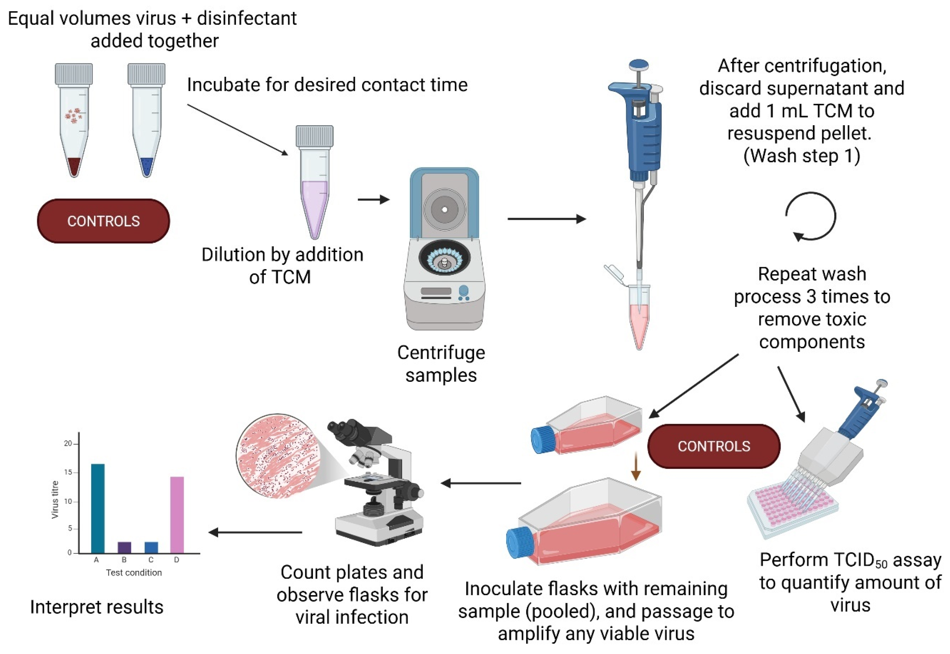 Equal volumes of the disinfectant and virus (50 µL) were added to a screw cap micro tube (Sarstedt, Nümbrecht, Germnay), in triplicate, for the desired contact time (5 min). The two droplets of disinfectant and virus were in direct contact but were not mixed. After 5 min contact time, 1 mL of TCM was added to provide a large-volume dilution of the disinfectant. The sample was then immediately centrifuged at 10K rpm for 5 min (MiniSpin microcentrifuge, Eppendorf, Stevenage, UK) and the supernatant discarded. A further 1 mL TCM was added to the tube, the sample resuspended, and the procedure repeated for a total of 3 washes (total of 3 centrifugation steps). An equal volume of virus and TCM were added together for 5 min in triplicate and treated as above as the positive control, to determine the maximum recovery of viable virus in the absence of any disinfectant. For toxicity control of the disinfectants, an equal volume of disinfectant and TCM (or TCM + TCM) was added together for 5 min, washed, and processed as for the test and controls, except that these samples were not performed in triplicate (no replicates within each round of testing, but performed in every round of testing). A standard TCID50 assay was performed on all samples to quantify the remaining viral load of washed samples. The remainder of all samples were pooled (or left as a single sample in the case of the toxicity controls) and inoculated into a T12.5 flask (Corning, NY, USA). After one week, the contents of all T12.5 flasks were further passaged into T25 flasks (Corning). Each serial passage was microscopically observed and scored for the presence or absence of viable virus (CPE), providing a qualitative output of infection.