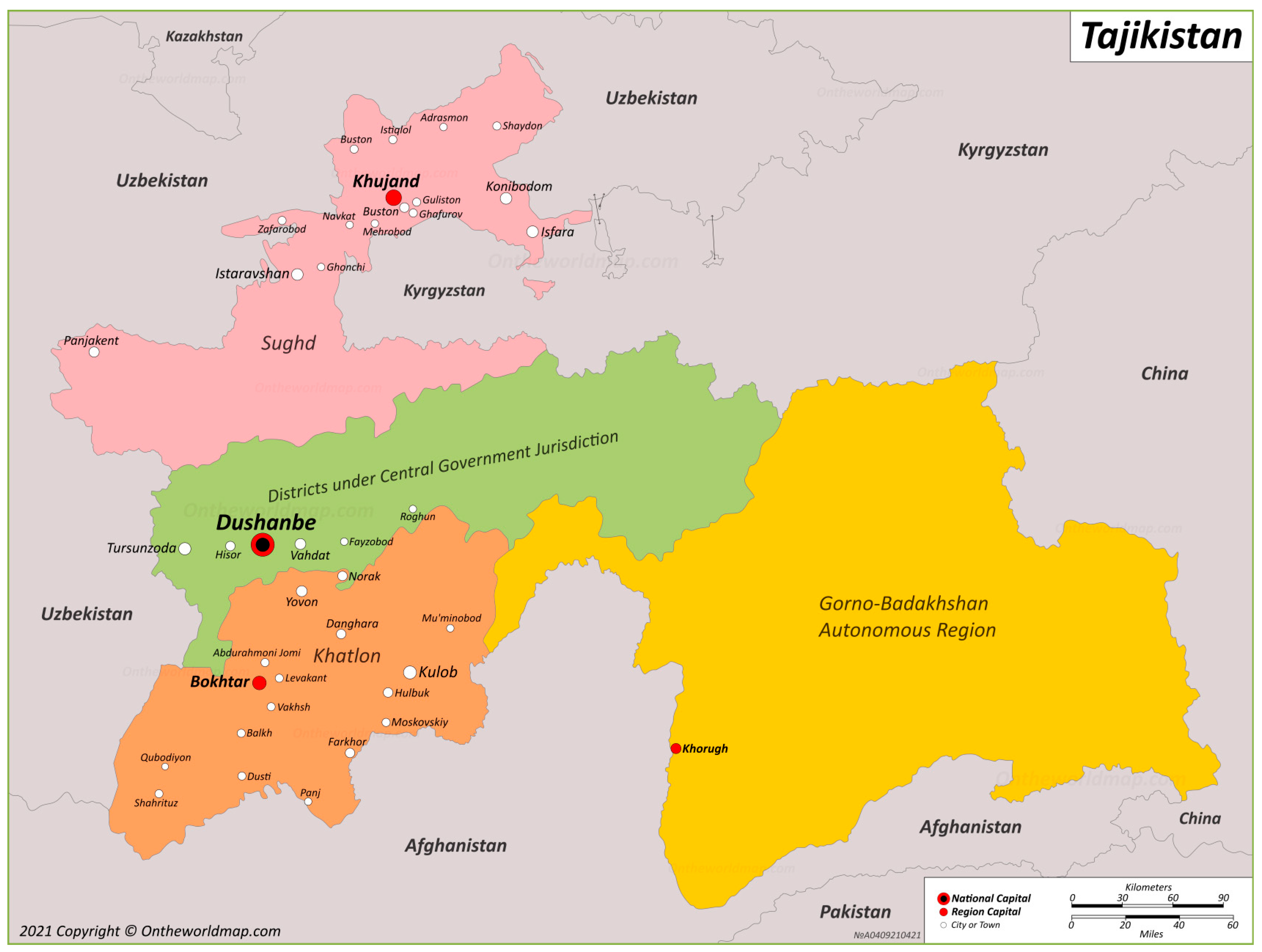 - OnTheWorldMap. Administrative Map of Tajikistan Showing Regions and Major Cities. 2021. Available online: https://ontheworldmap.com/tajikistan/ (accessed on 12 November 2025).