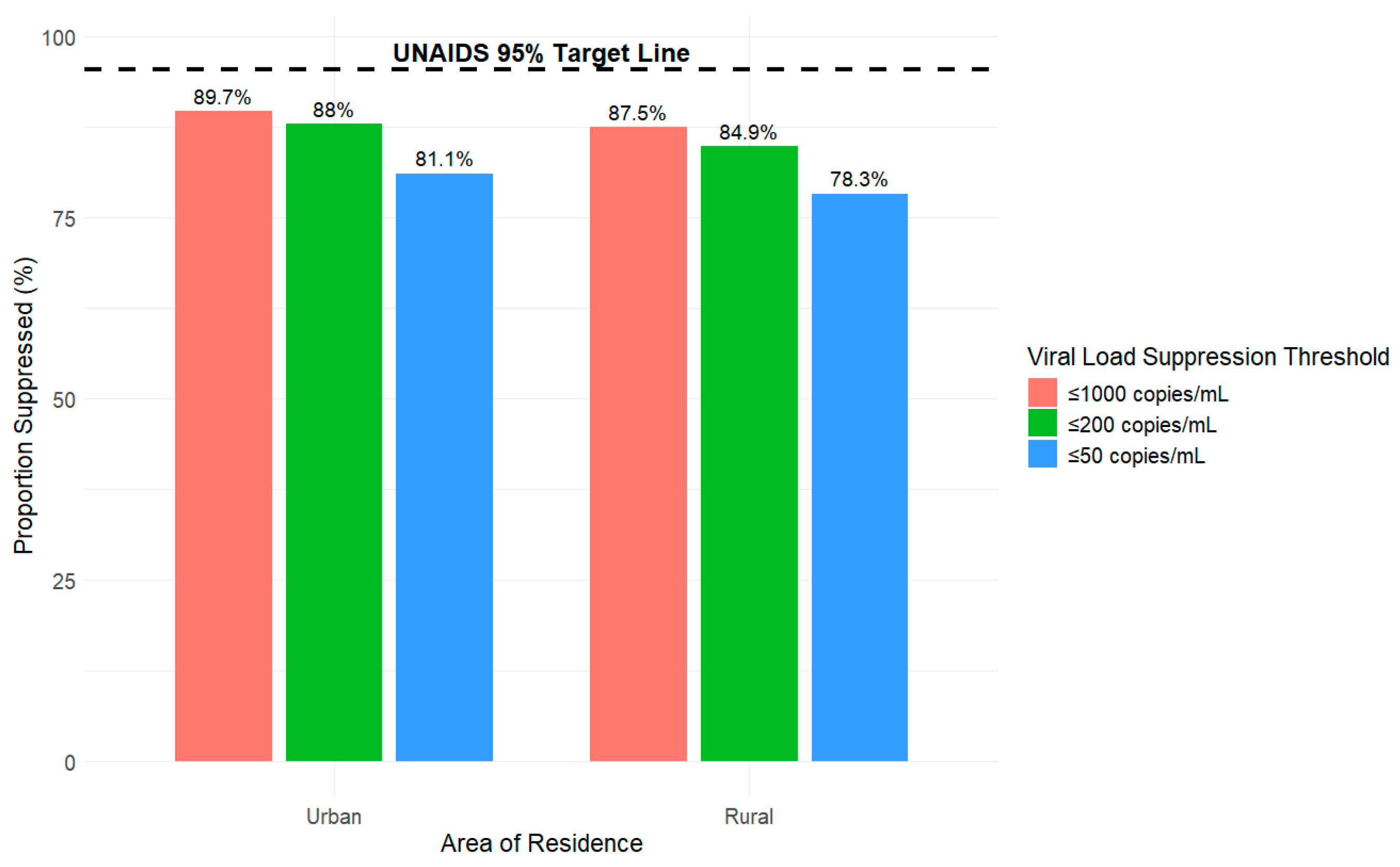 3.4. Viral Suppression Disaggregated by Area of Residence