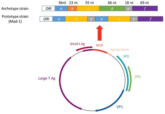 - Frisque, R.J.; Bream, G.L.; Cannella, M.T. Human polyomavirus JC virus genome. J. Virol. 1984, 51, 458–469. [Google Scholar] [CrossRef]
