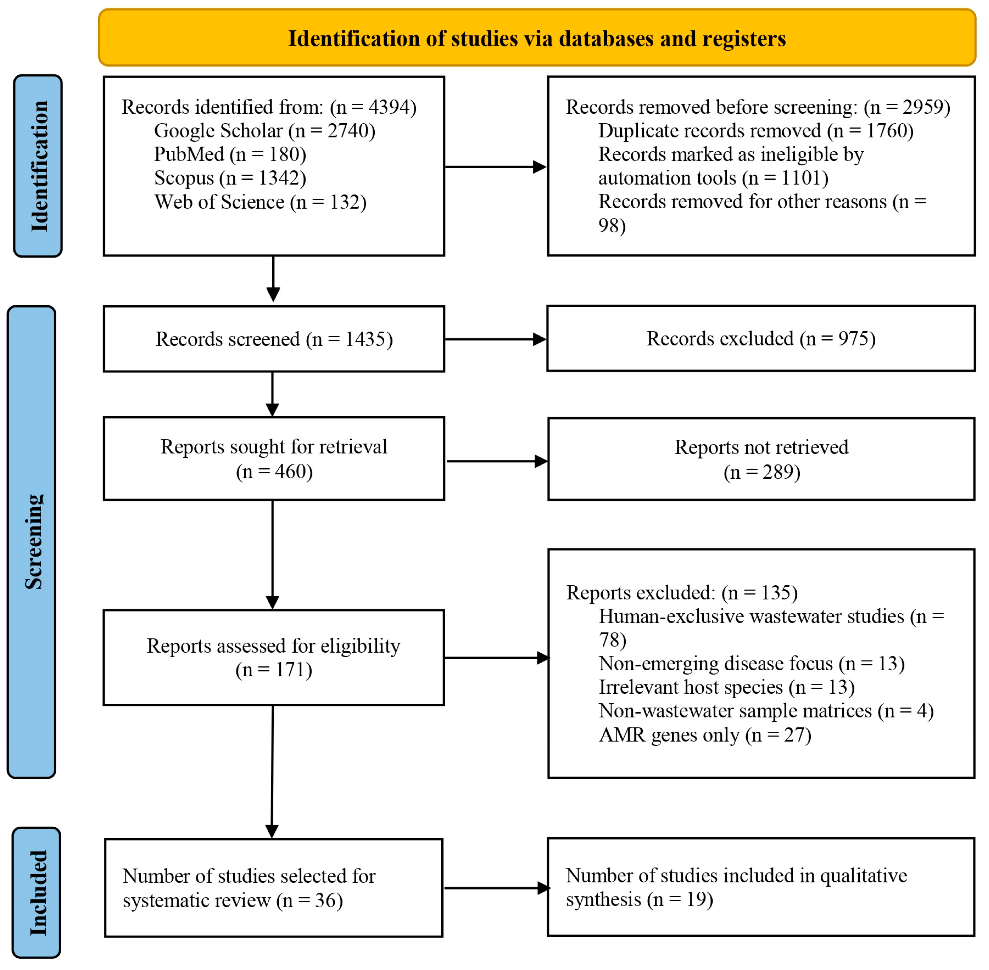 Shaha, M.; Das, A.; Saha, J.; Rahaman, M.M.; Gupta, M.D.; Talukder, S.; Sarker, S. Wastewater as Sentinel for Emerging Viral Diseases in Livestock: A Systematic Review. Viruses 2026, 18, 385. https://doi.org/10.3390/v18030385