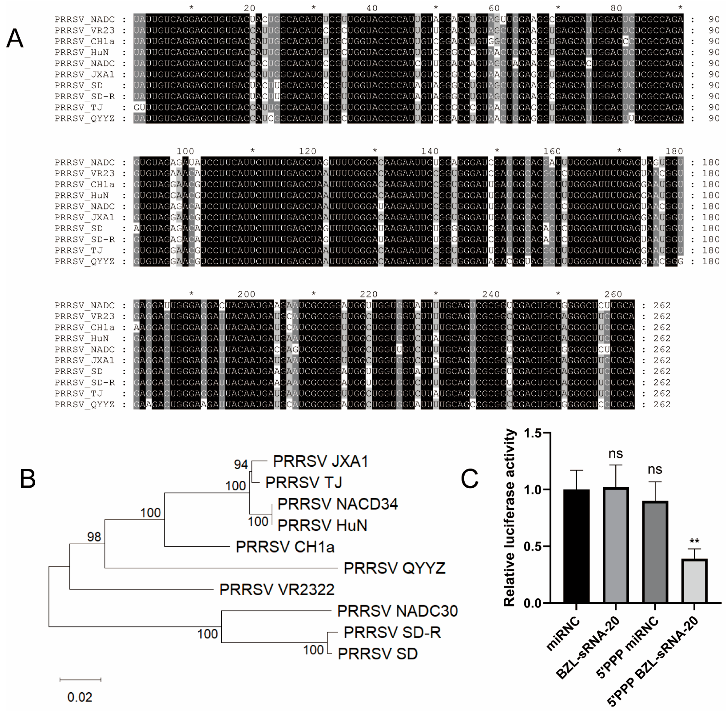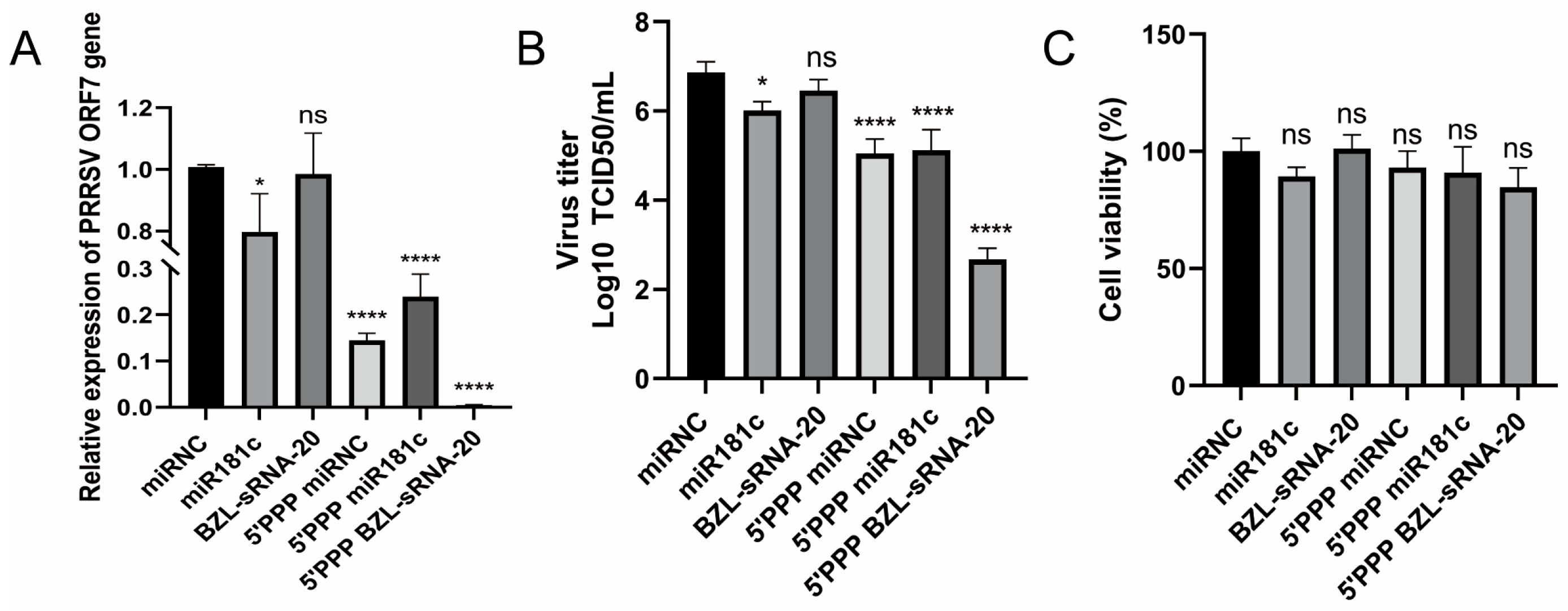 3.2. 5′-PPP BZL-sRNA-20 Potently Inhibits PRRSV Replication In Vitro