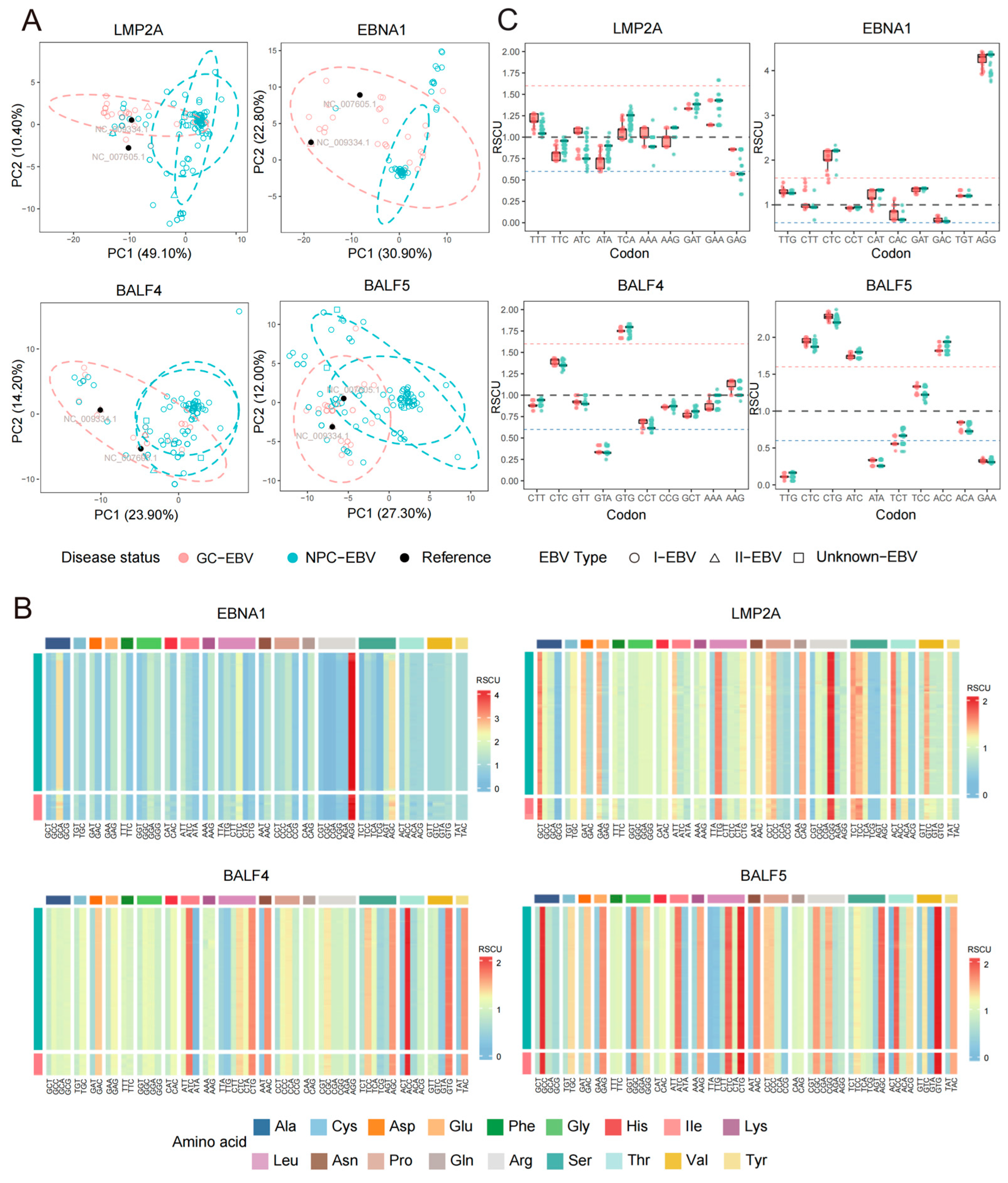 Chicago/Turabian StyleLi, Xiaoqian, Xianyang Huang, Wan-Ting Li, Guy Baele, Liyuan Liu, Siyan Li, Jianjun Dai, and Wan-Ting He. 2026. "Codon Usage Bias Variation and Evolutionary Signatures of Epstein–Barr Virus in Distinct Epithelial Cancers" Viruses 18, no. 4: 425. https://doi.org/10.3390/v18040425