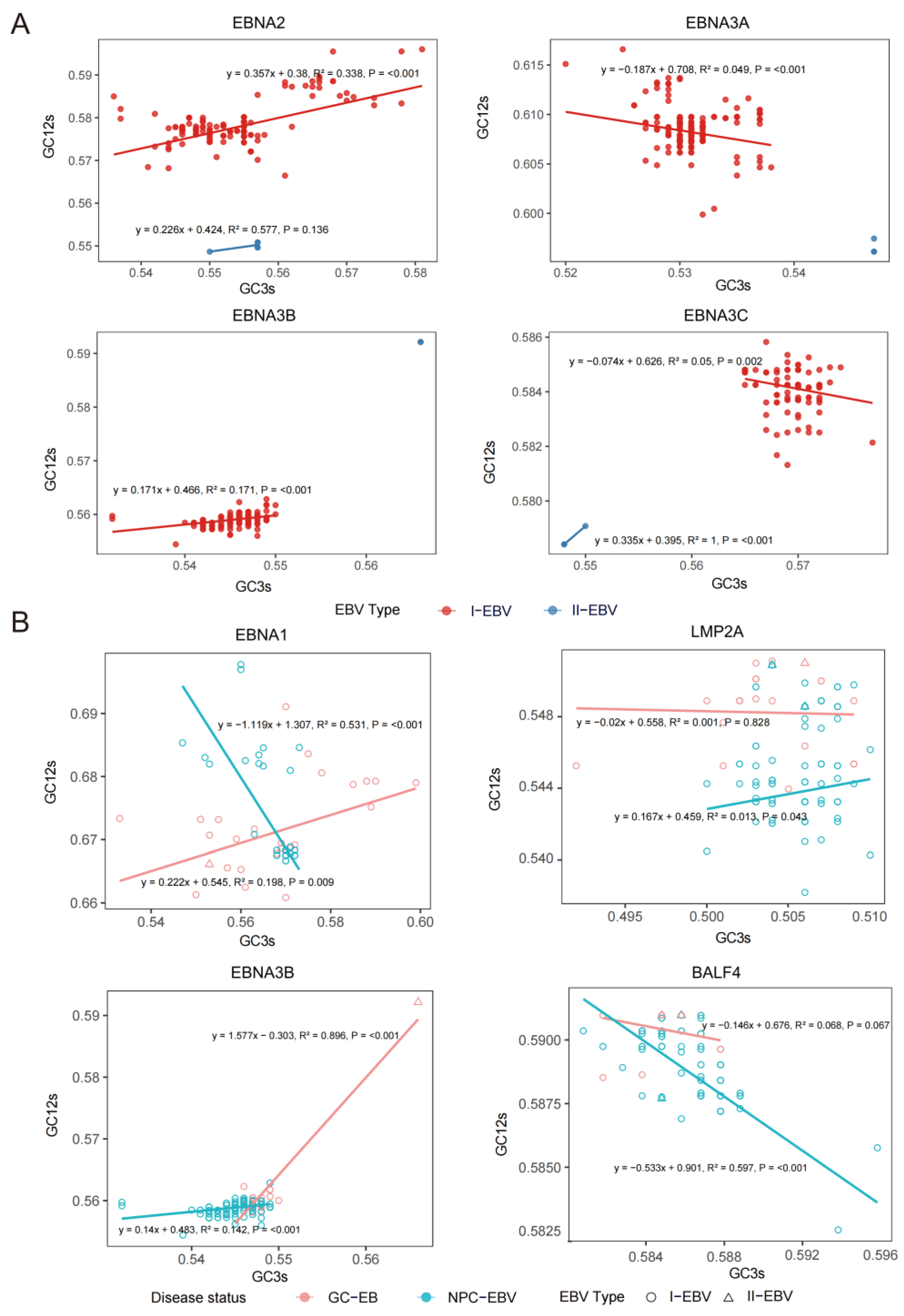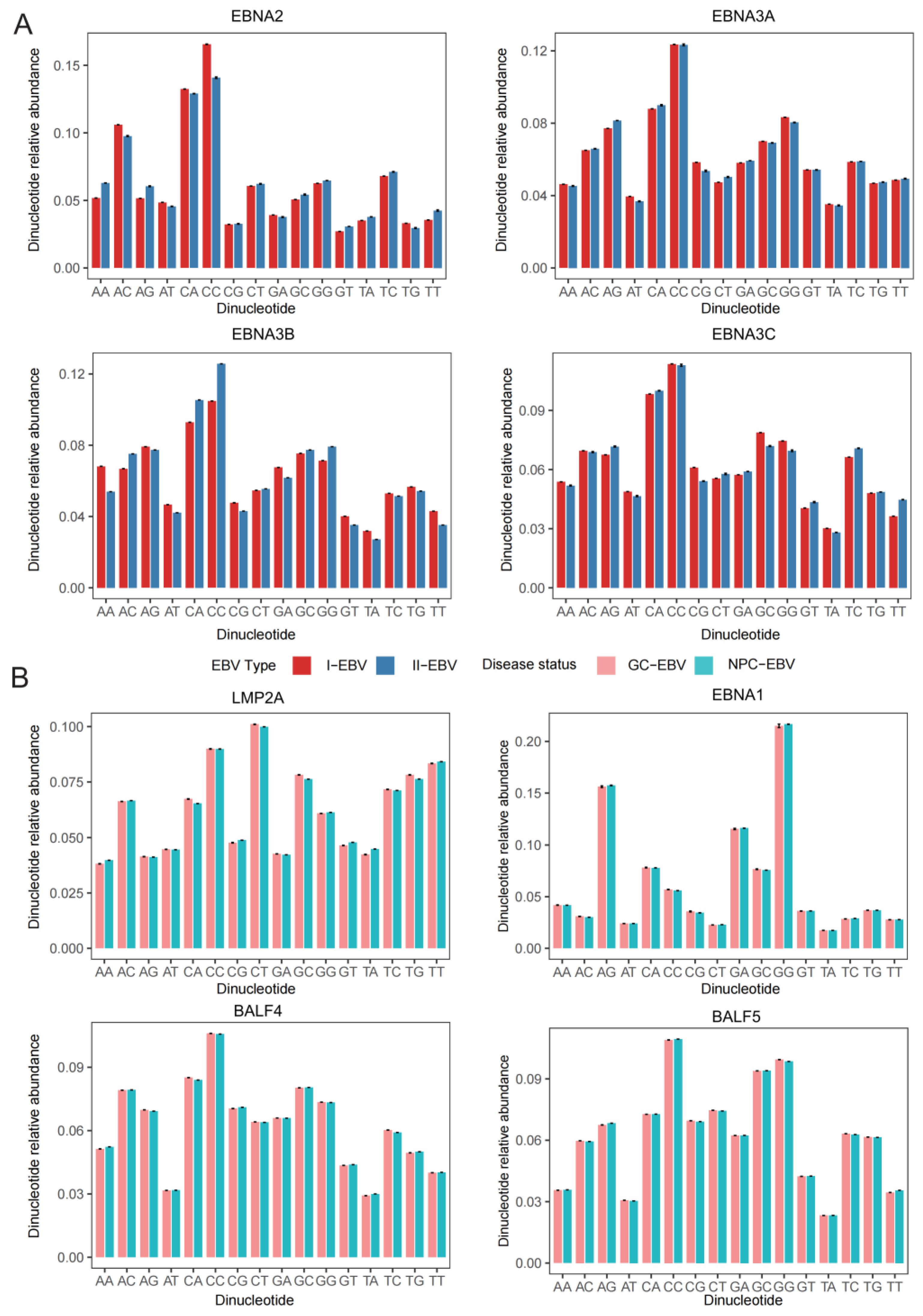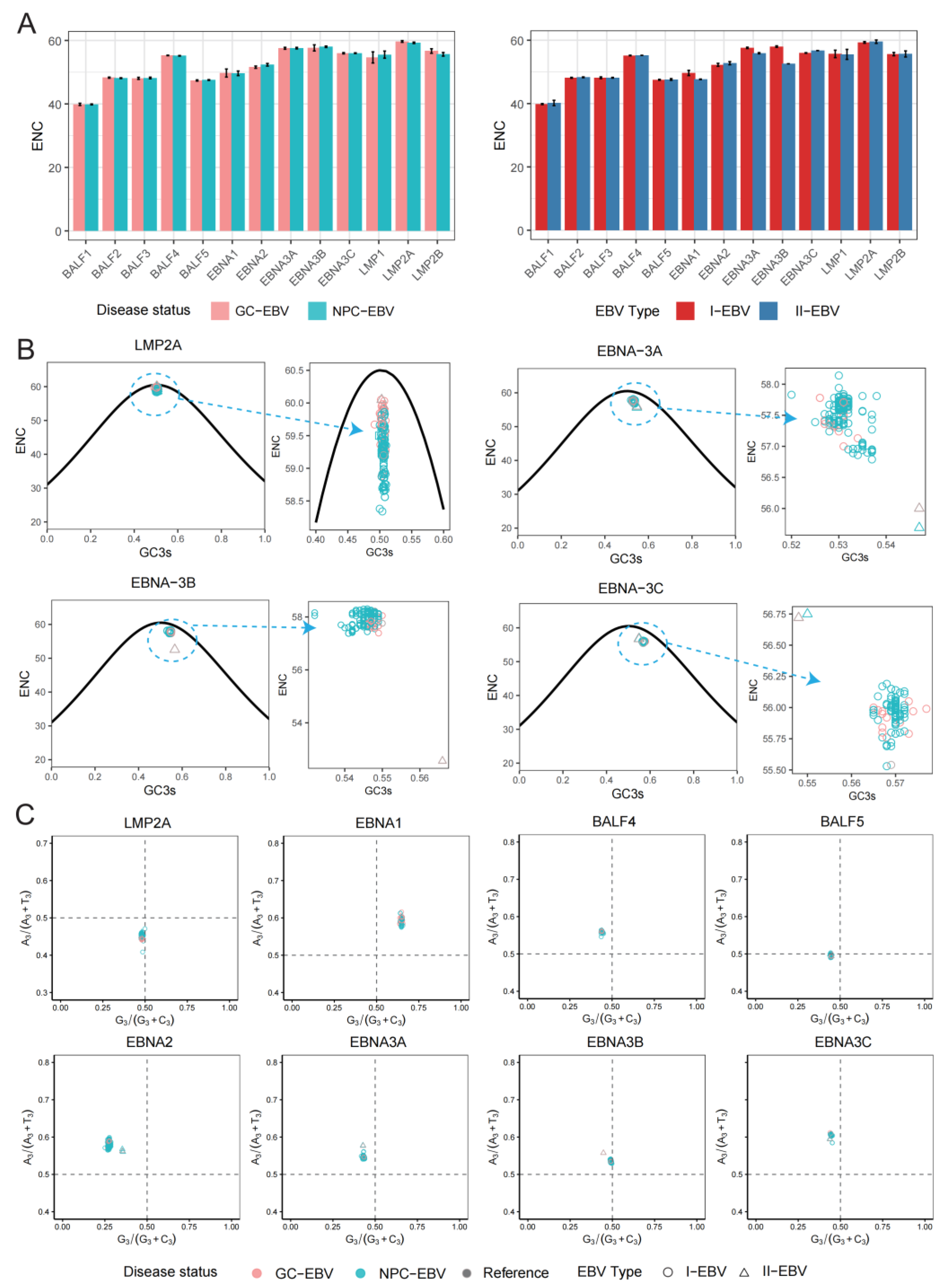 2.2. Nucleotide Composition and Third-Position Base Preference of EBV Core Genes