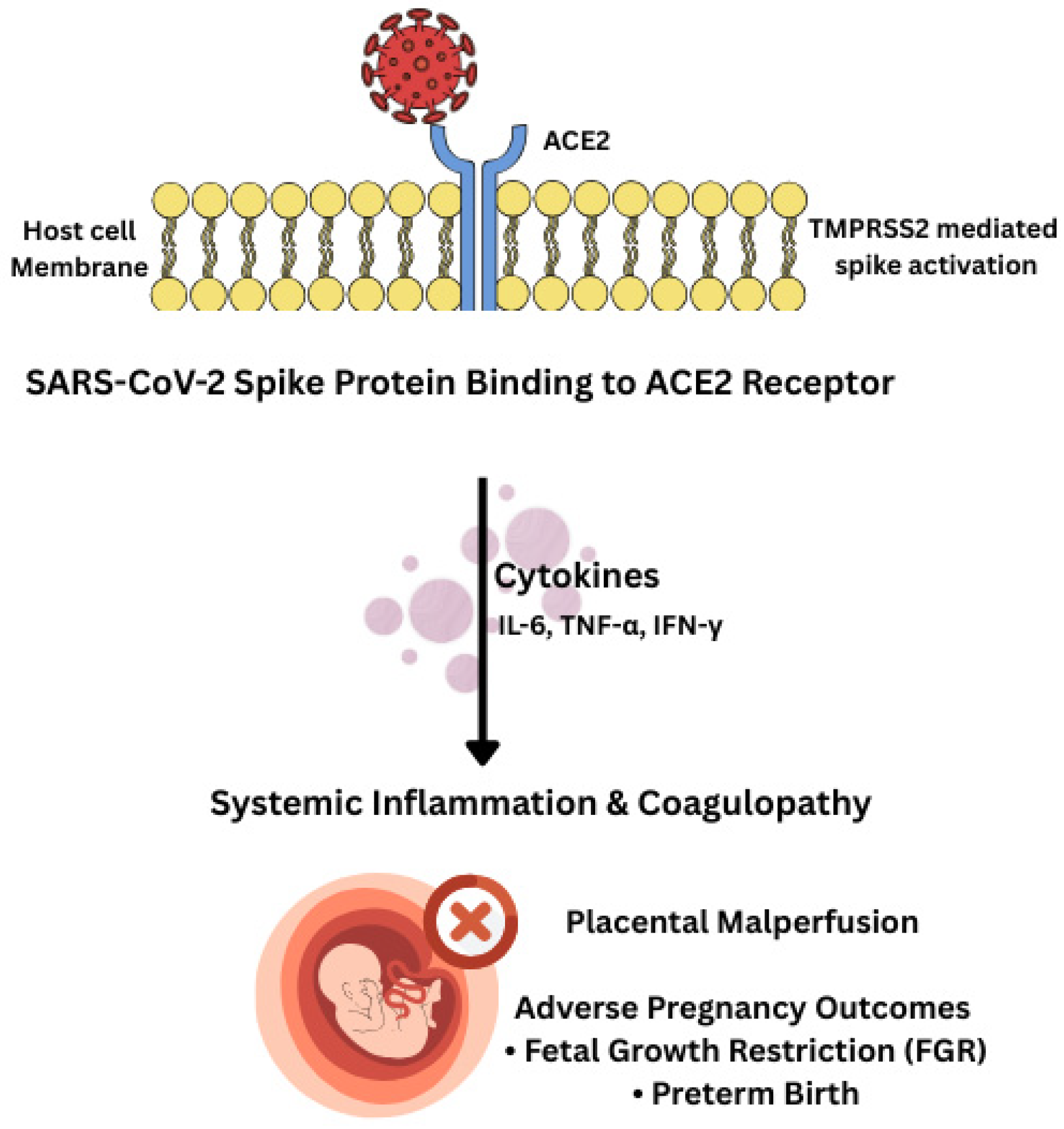 The schematic illustrates the sequential progression from viral spike–ACE2 binding and protease-mediated priming to systemic immune activation, characterized by elevated cytokines. These events drive endothelial dysfunction and coagulopathy, culminating in placental malperfusion and adverse clinical outcomes, including preterm birth, fetal growth restriction (FGR), and preeclampsia-like syndrome. Note: Color variations are utilized for visual clarity and do not indicate functional categories.