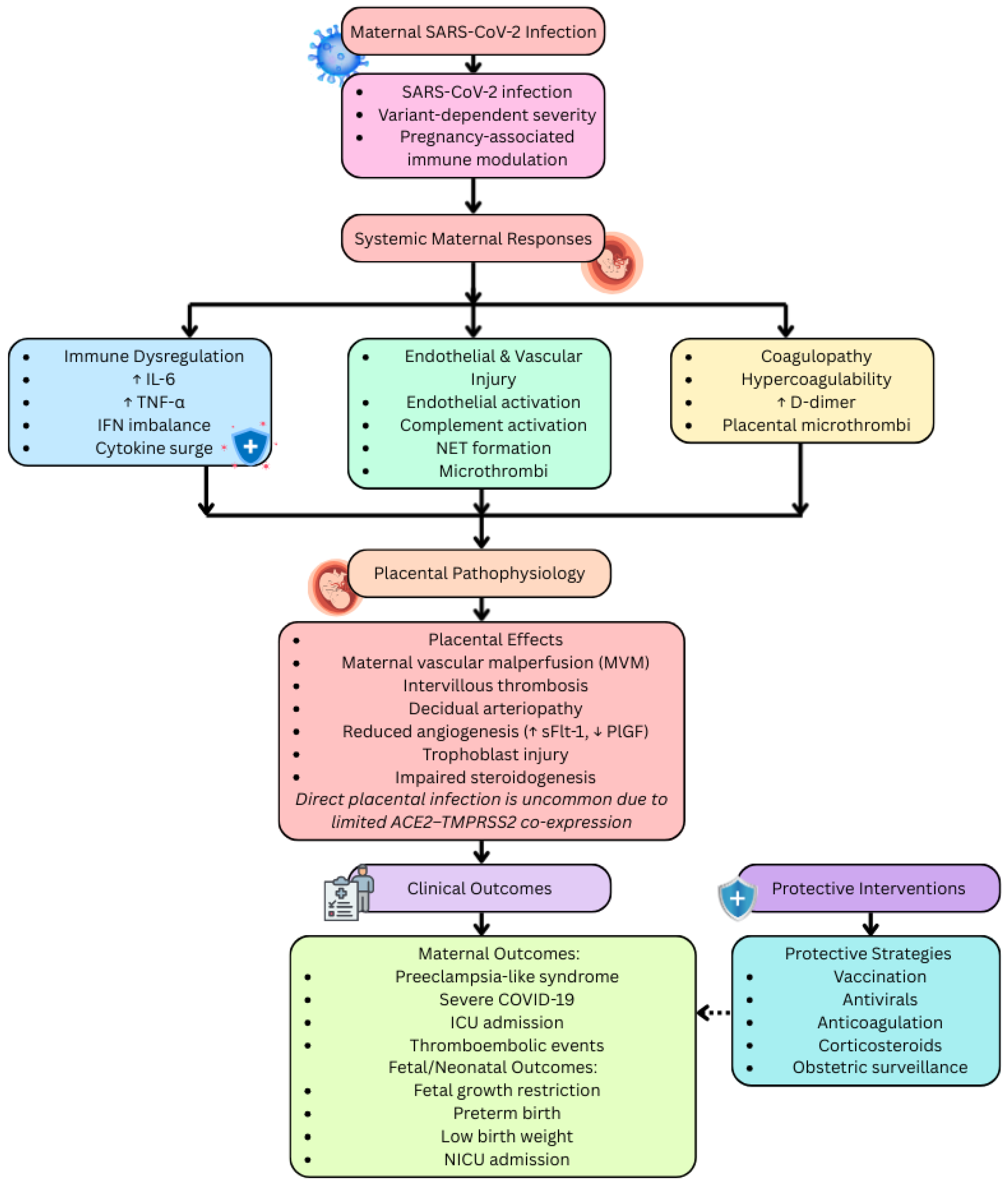 35]. These findings underscore that cytokine-driven immune dysregulation, rather than direct viral replication, is a primary determinant of adverse obstetric outcomes in severe COVID-19.