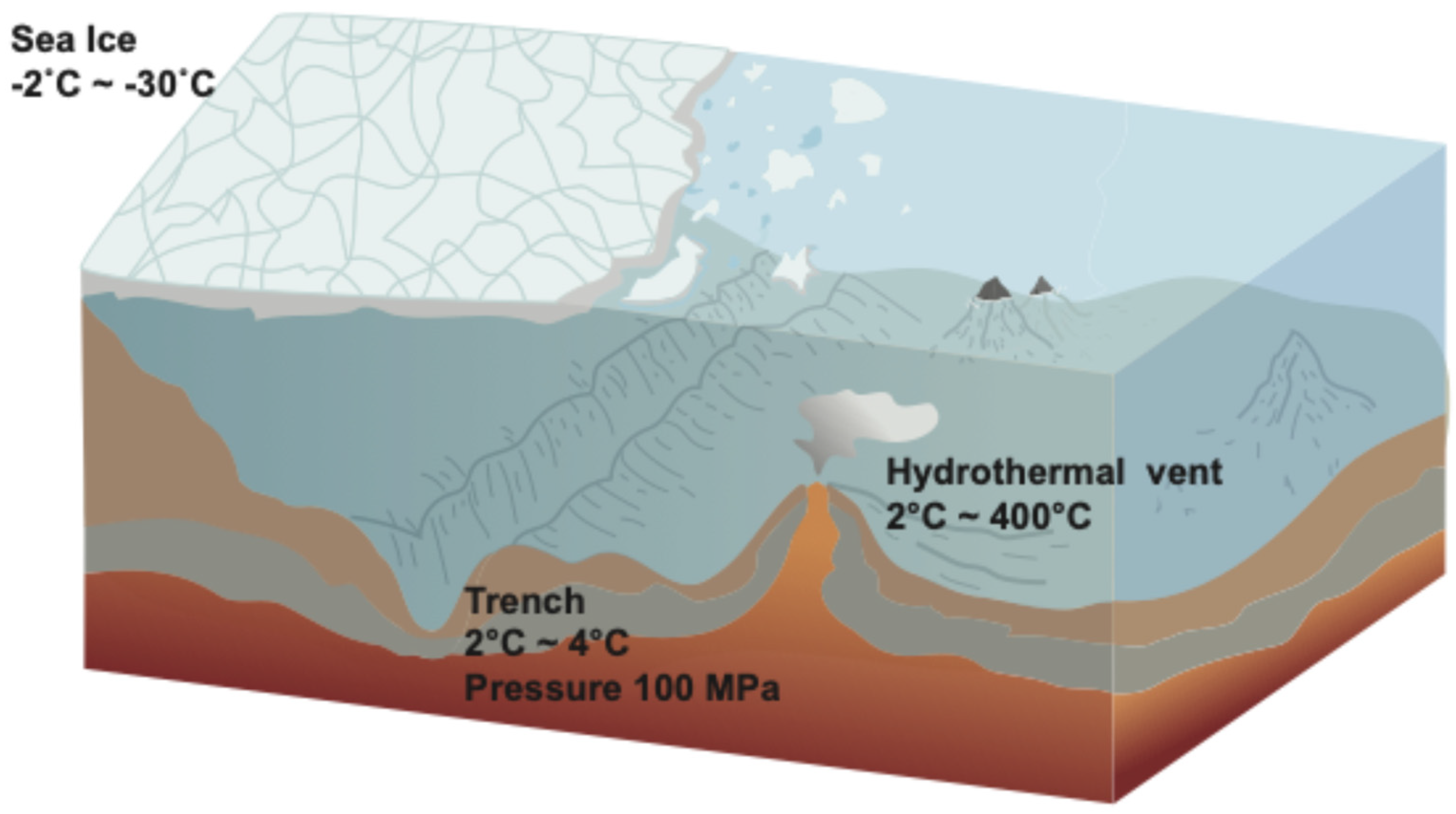 - Xiao, X.; Zhao, W.; Song, W.; Qi, Q.; Wang, B.; Zhu, J.; Lin, J.; Wang, J.; Hu, A.; Huang, S.; et al. Microbial ecosystems and ecological driving forces in the deepest ocean sediments. Cell 2025, 188, 1363–1377. [Google Scholar] [CrossRef]