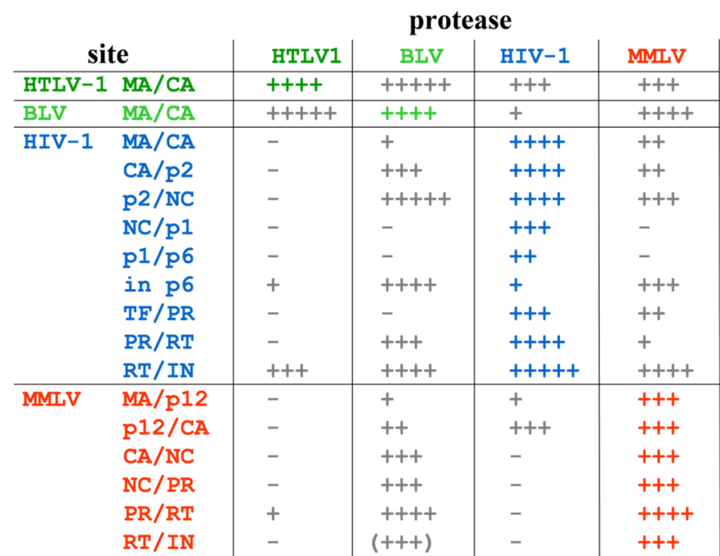 Specificity studies of retroviral proteases typically utilize protein substrates or oligopeptides. As crystal structures have been determined for various retroviral proteases [] or molecular models could be built with high certainty, specificity studies have been frequently complemented with molecular modeling to understand the molecular basis of PR specificity. However, as no generally accepted and widely used standard assay conditions have been established in the retroviral protease field, and the PR is highly sensitive to the pH, ionic strength and type of the substrate (e.g., protein versus peptide, or the presence of ionizable side chains such as Glu), it is difficult to quantitatively compare data published by different laboratories. Furthermore, while it has been a commonly used strategy to compare the specificity of a PR of a given retrovirus to that of another one (typically to that of HIV-1), only a few studies dealt with the comparison of more enzymes. In this review, after the description of the specificity results regarding some representative proteases, the comparative studies involving a set of proteases will be summarized.